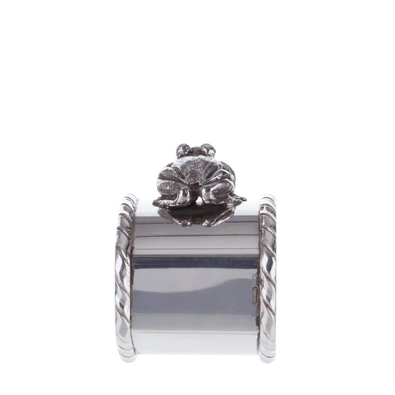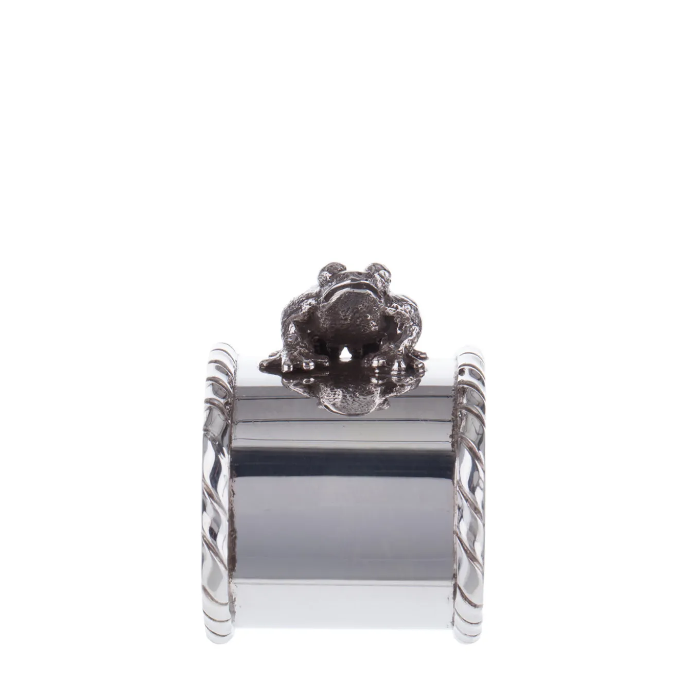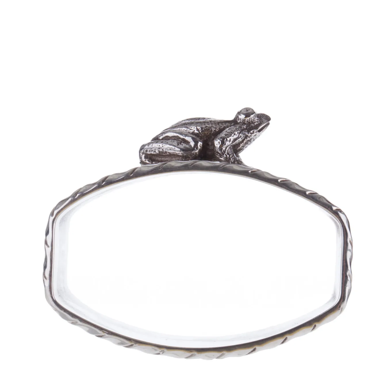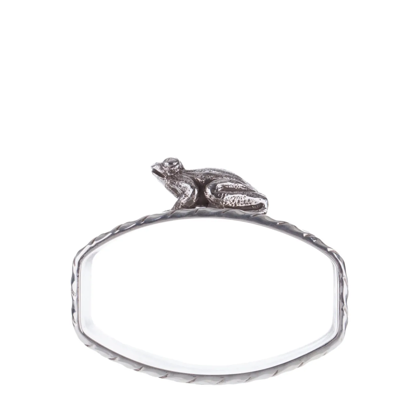 This is a sterling silver napkin ring by Florentine silversmiths Pagliai. The piece features a San Marco style rim and a graceful statuette of a frog created using the lost-wax casting technique. Pagliai offers different animal-inspired napkin rings that can be mixed and matched according to your taste.