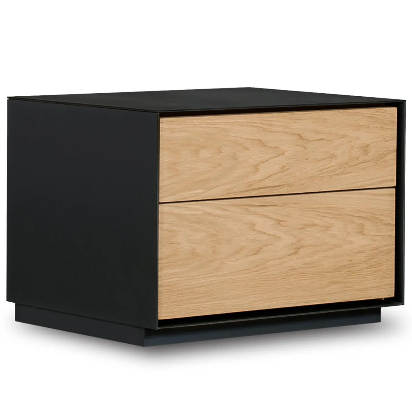Minimalist and unadorned class characterize this exquisite nightstand, modern design conceived for favoring the focus on its natural components. The couple of drawers it is equipped with sports durmast fronts, their unpredictable knot-free grain being the only decorative trait of the whole design. Urban influence is revealed by the anthracite-gray-lacquered iron shell and plinth base.