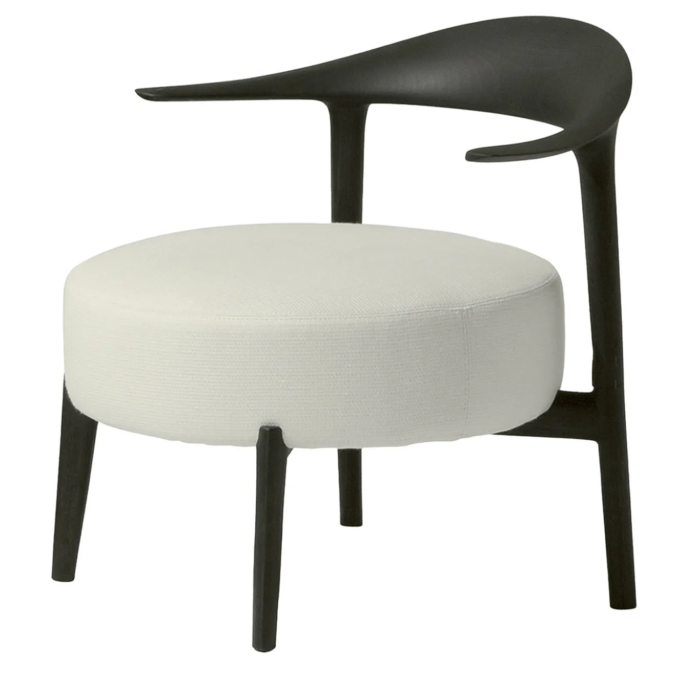 Sophisticated and elegant in its low, rounded shape of unique style, this black and white lounge chair is a timeless and iconic design piece to complement a contemporary interior setting. Handmade of ash wood, it is finished in an anthracite hue also available in other shades of gray and brown. Softly padded with flexible and multi-density polyurethane foam, it is covered with fiber and upholstered with fabric or leather upon choice.