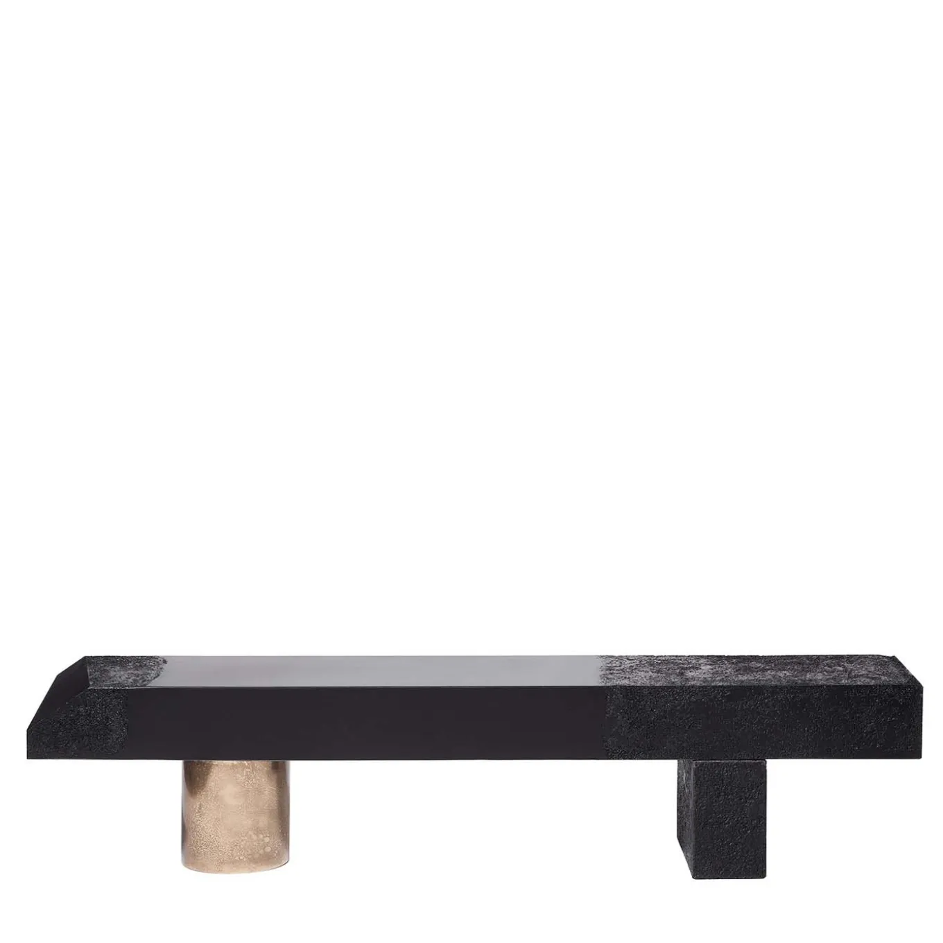 Textured and sturdy, Rive is a massive bench that expresses the aesthetic of megalithic architecture through the assembly of three essential structural components. The seat, with its irregular edges, rests on a concrete cuboid leg and a brass cylinder, the veins of which are obtained through an acid-etching treatment. The surface of the concrete, on the other hand, alternates between perfectly smooth and corroded portions, created using a manual technique involving the use of sea salt.