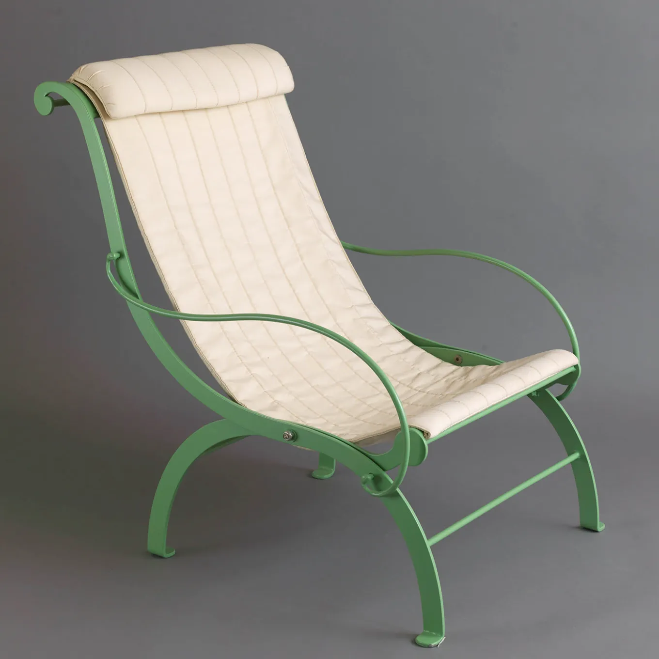 The elegant design of this armchair allows to comfortably lean back and relax in an outdoor space. The forged stainless steel structure is foldable, allowing for easy storage during inclement weather. Distinctive for its curved lines inspired by traditional silhouettes interpreted with modern sensibility, this chair is treated with zinc and varnished with powder while the padded headrest cushion is upholstered with outdoor fabric.