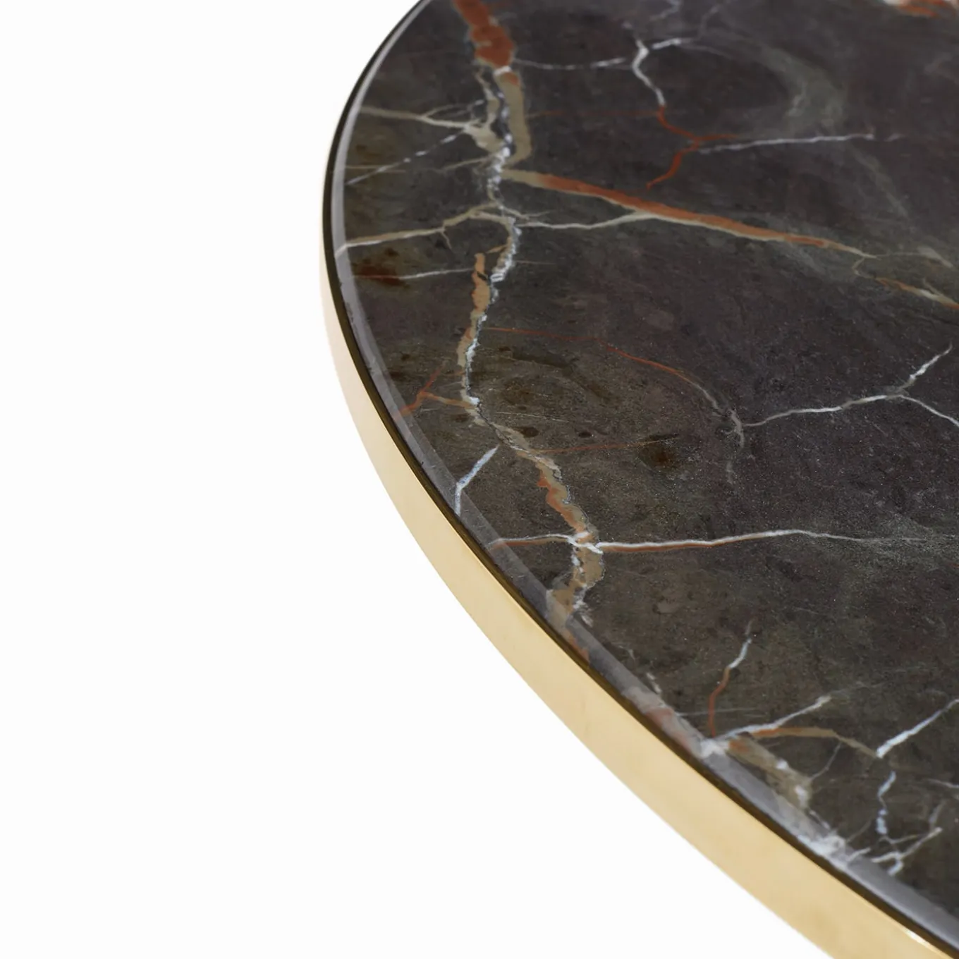 Defined by clean lines and balanced proportions, this bistro table features a circular top in black Marquina marble with a slim satin brass edging that accentuates its refined material quality. The base comprises a sleek black lacquered iron column and a broad, stable round footing. The design evokes the elegant simplicity of the Art Deco style through a contemporary form, making it a sophisticated addition to modern interiors.
