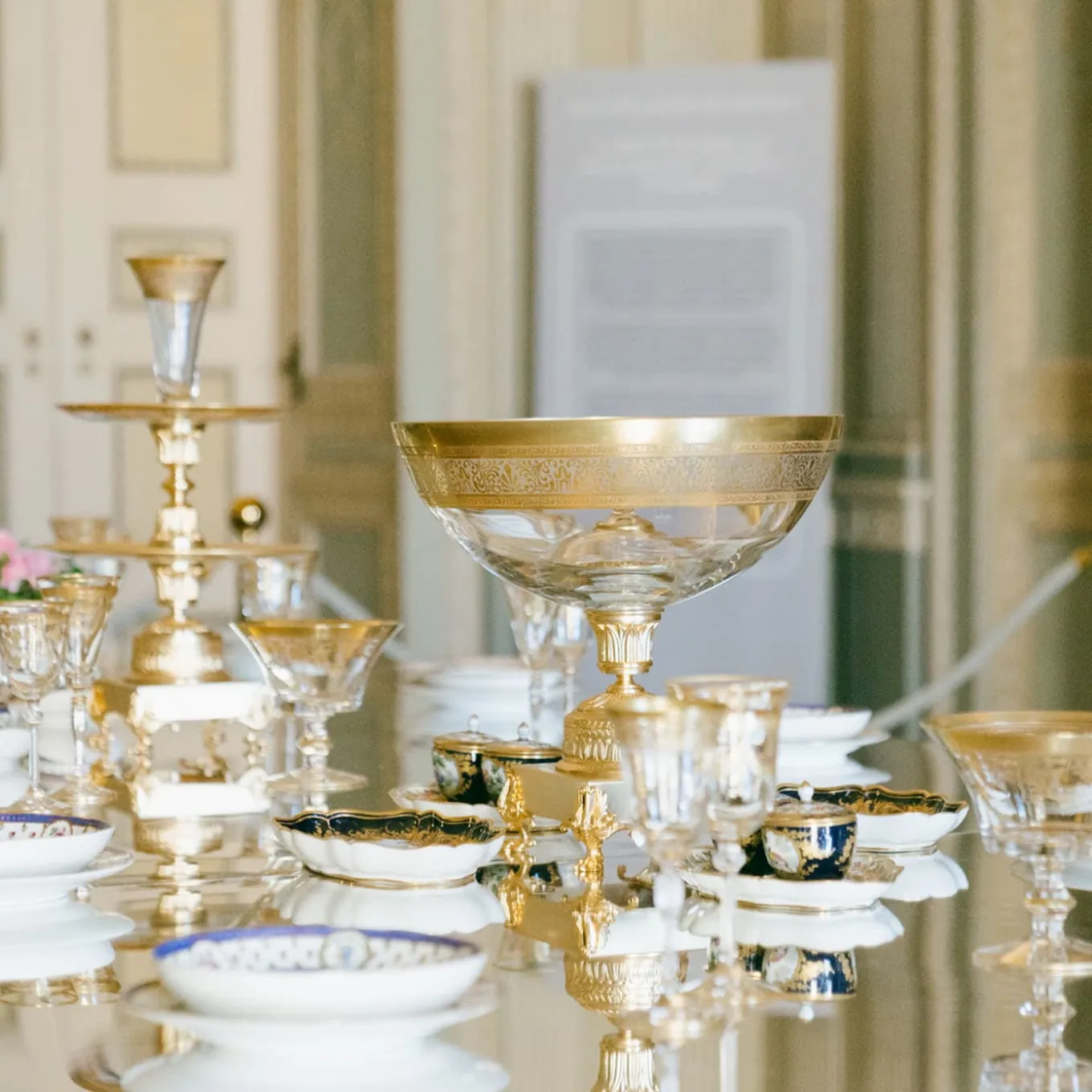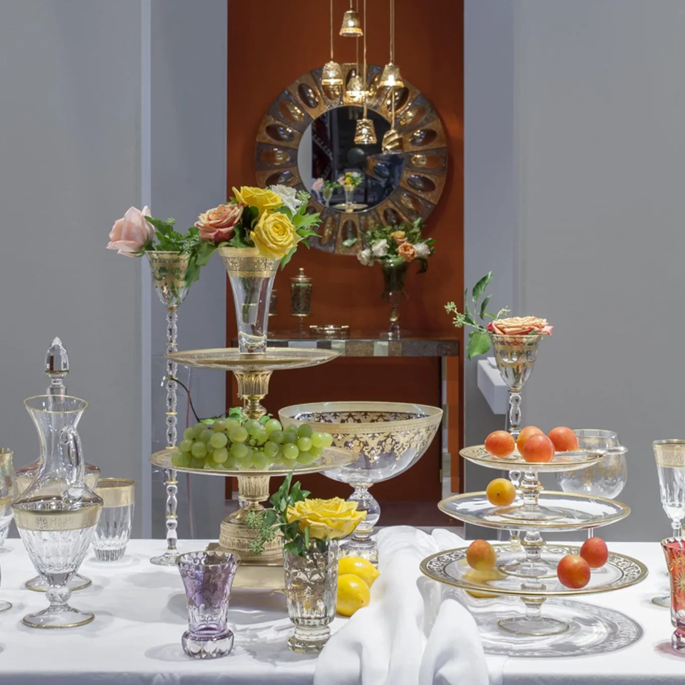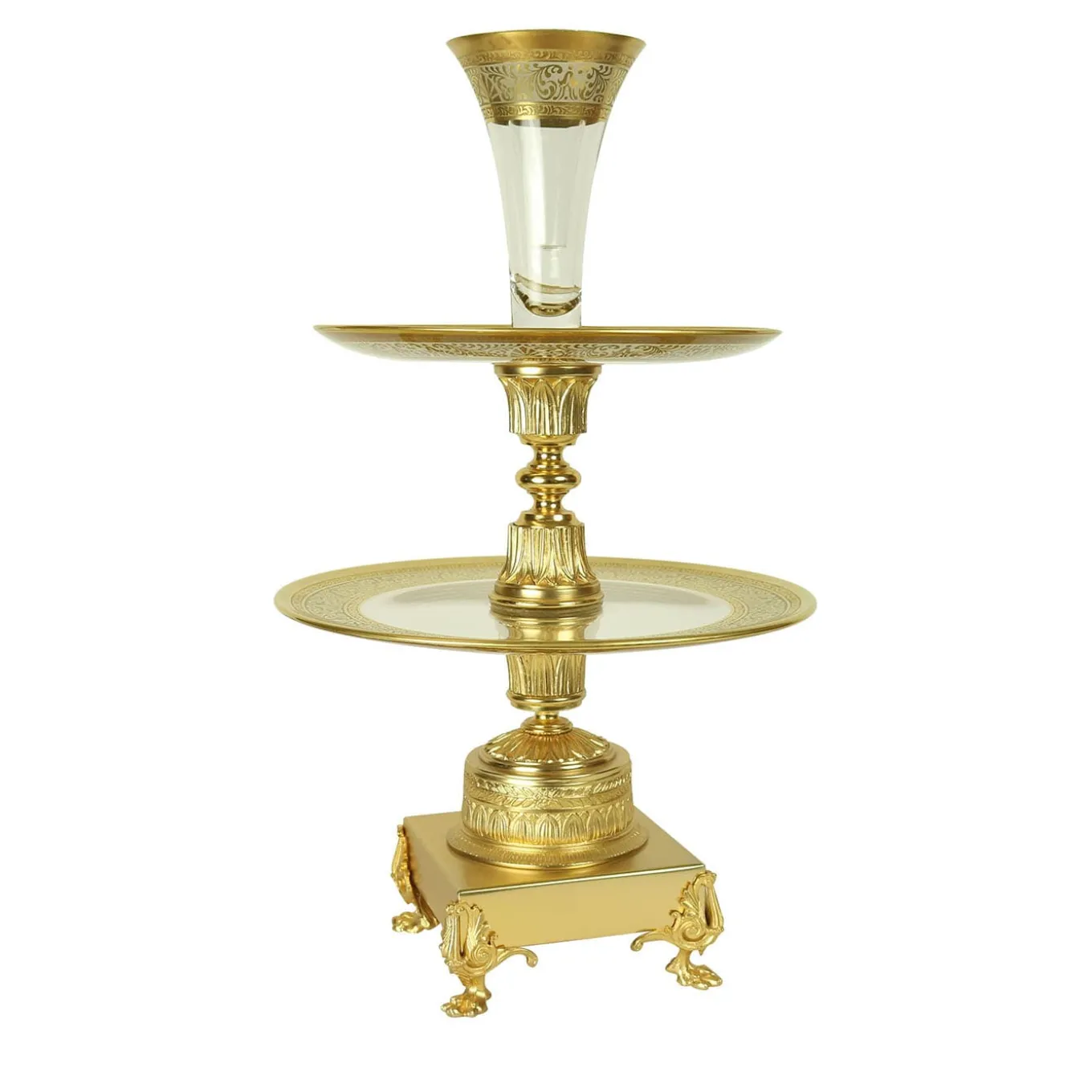 Part of the neo-classical style Rome Collection of timeless sophistication, this decorative cake stand exudes exceptional refinement and opulence. Ideally complementing a luxurious and elegant interior of both private or public and contract nature, it is handcrafted of mouth-blown glass enhanced with pure gold details, and mounted on gold-finished bronze.