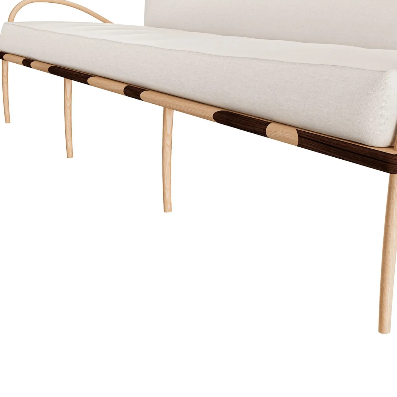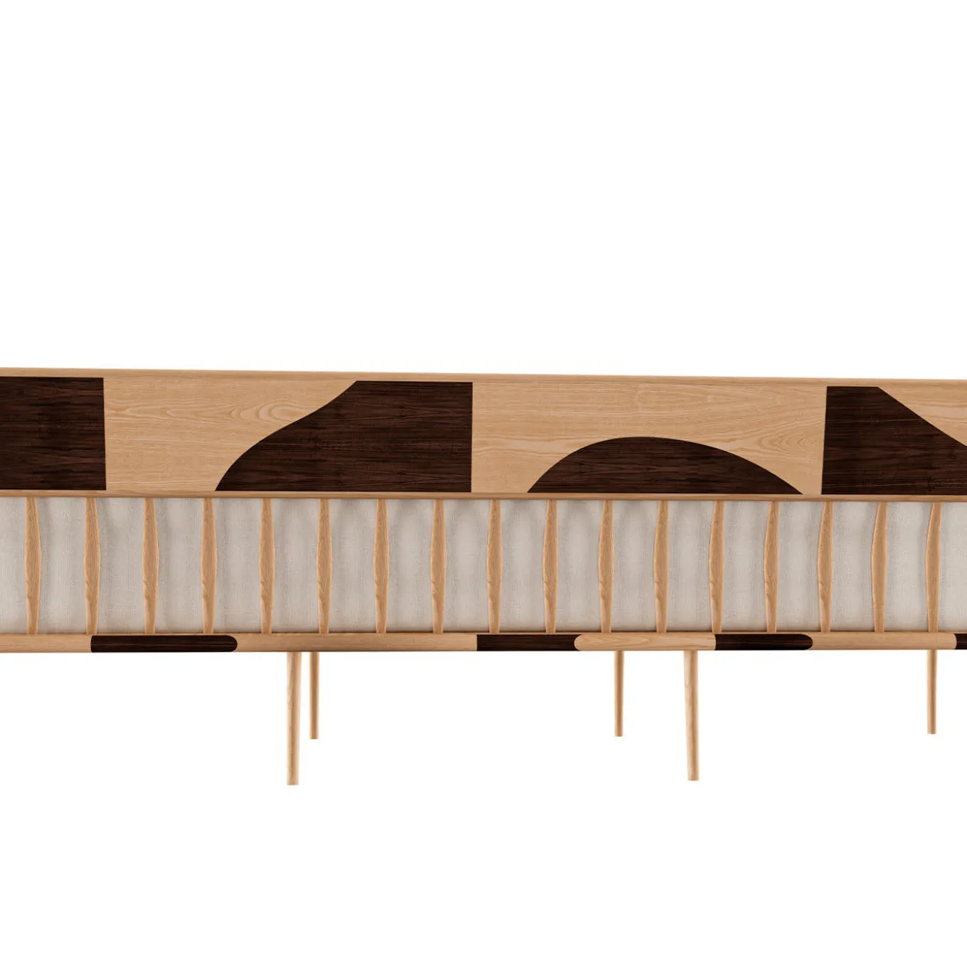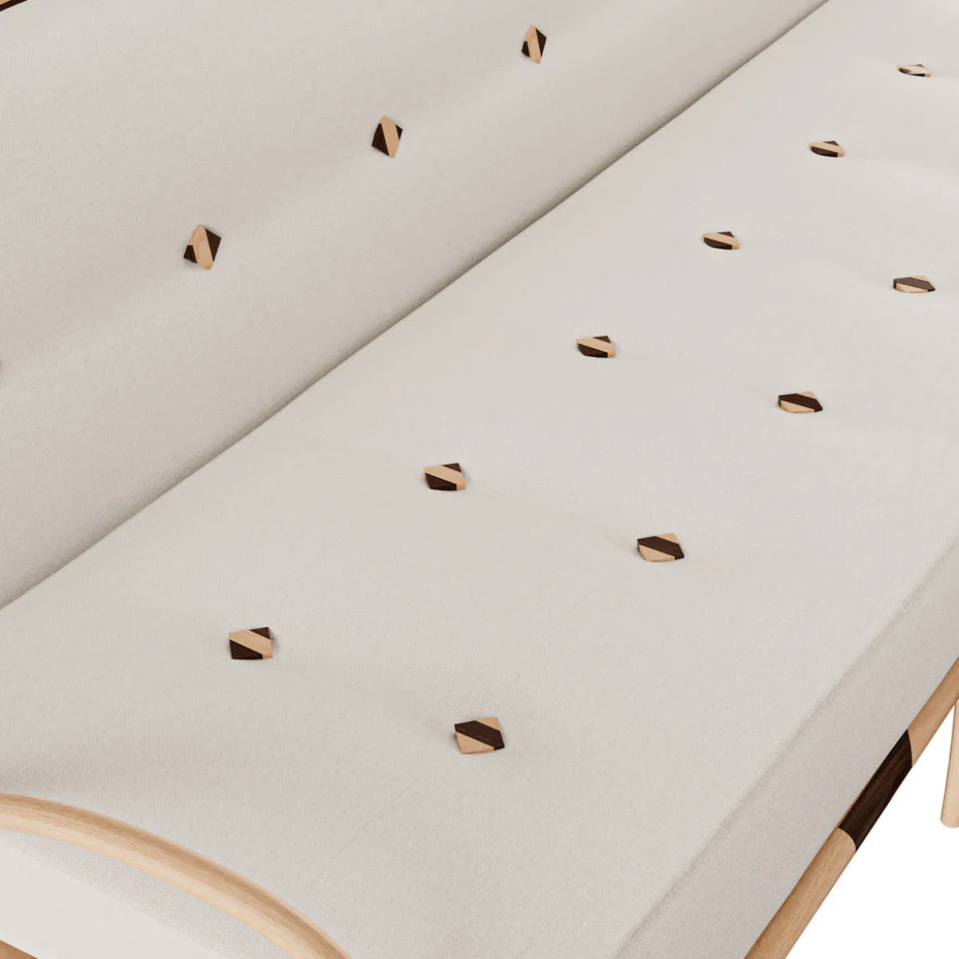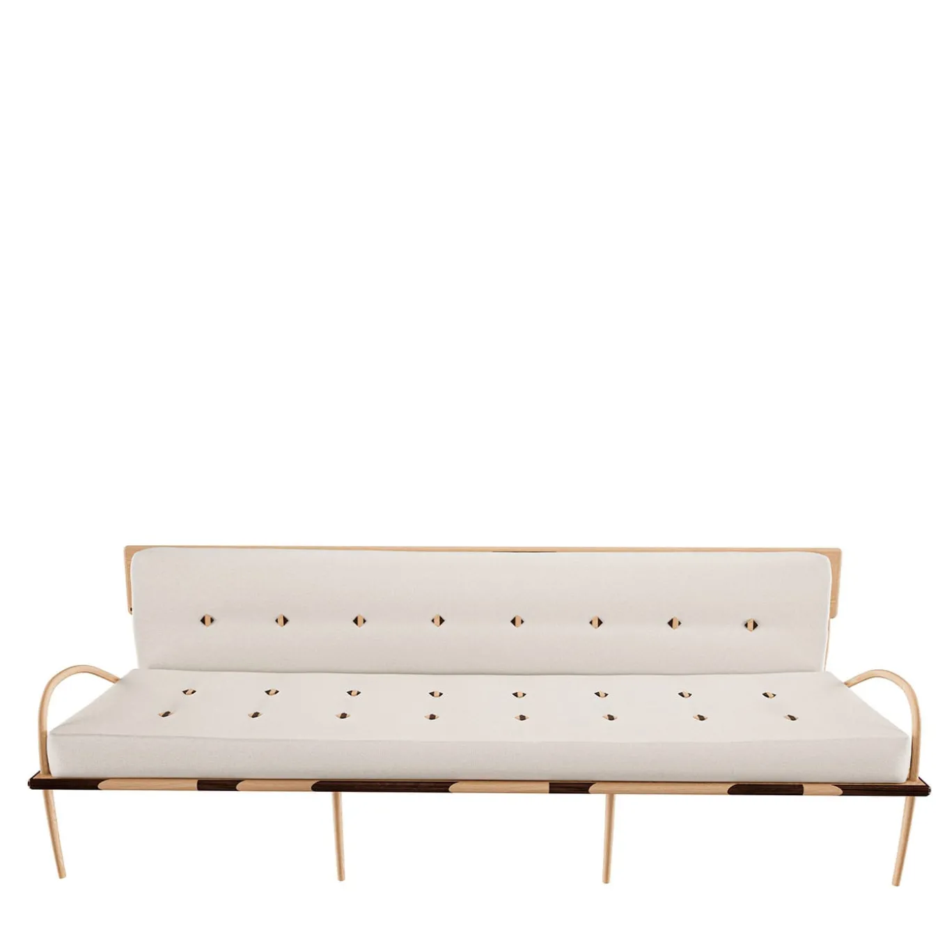 Feminine and graceful yet distilling daring charm, this sofa is an exclusive design conceived having in mind ancient Moroccan seats and exquisitely contemporary style. The distinguishing trait is the precious inlays of ash and Canaletto walnut characterizing both the structure and the buttons. The curved arms are fashioned by thermoforming and manual shaping of solid ash. Please contact the Concierge for customizations.