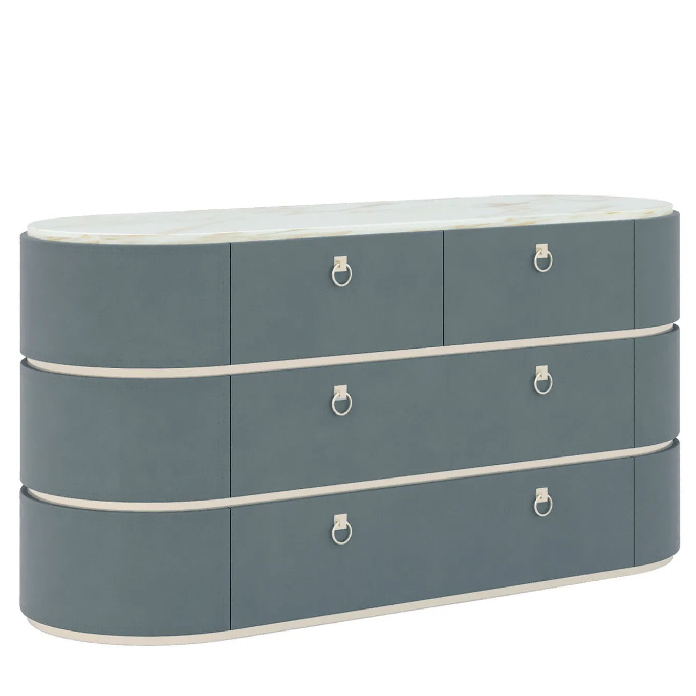 This grand cabinet will not disappoint with its sumptuous volumes and its functional storage space. The rounded silhouette is brought to life by a wooden frame upholstered in an avion-blue nabuck leather that delicately contrasts with the Gold Calacatta marble top and bands between the rows of drawers. The metal handles are delicately fashioned and finished in a Champagne hue, sealing the quiet luxury of the piece. Please contact the Concierge for further details and care instructions.
