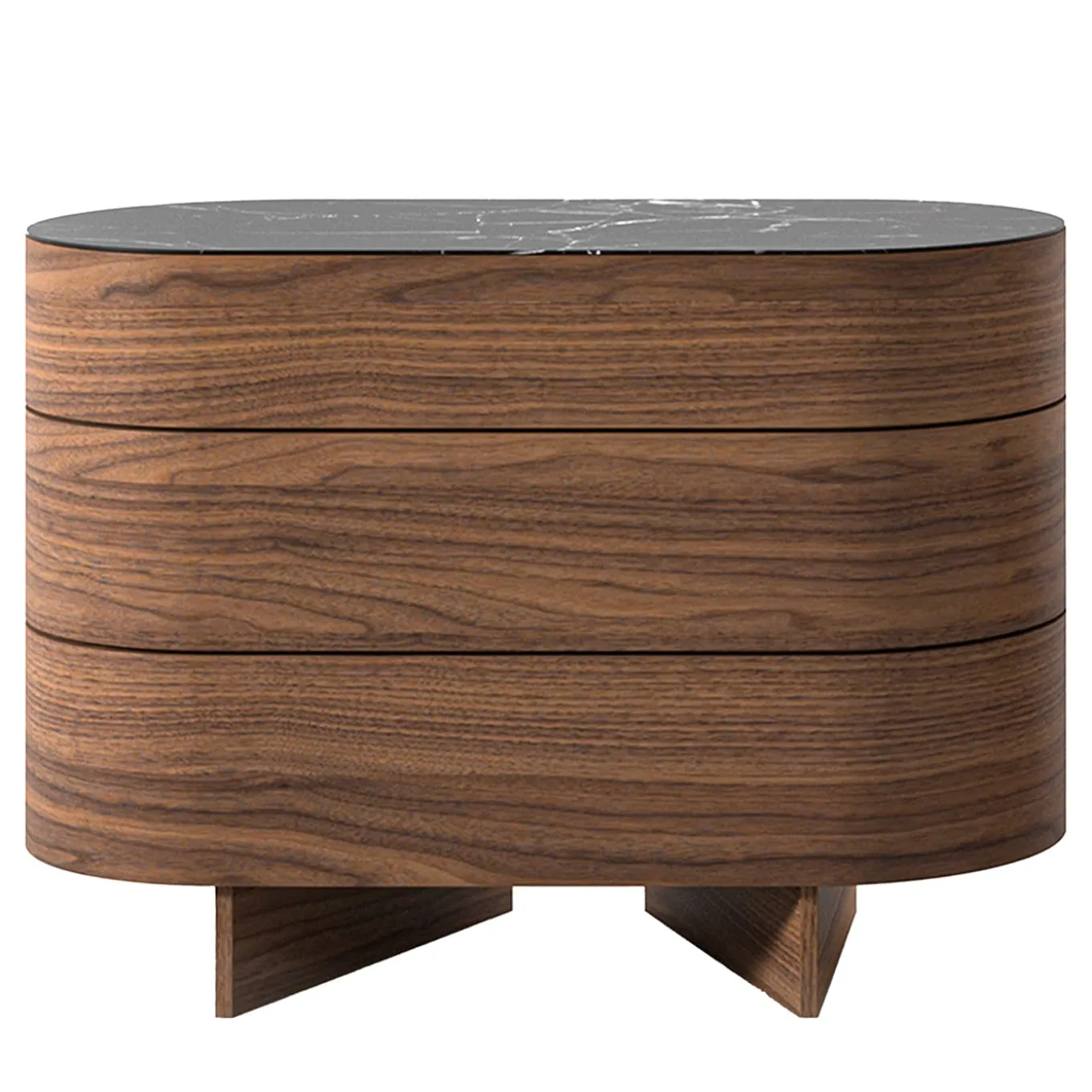 Rondos – Cabinet with 3 drawers, structure in Canaletto walnut wood, top in Marquina marble (COD. M02). This chest of drawers is characterized by soft, rounded forms that match the Bio-mbo bed and bedside tables to create a welcoming and informal bedroom space. The structure and feet are made of curved wood with a stained black oak, Canaletto walnut, or burgundy oak veneer; the wooden drawers have a push-pull opening and a soft closing mechanism, while the top is in veneered MDF in the same wood as the structure or in three marble variants: Carrara, Marquinia, Grigio Carnico. Rondos is available in two sizes: with two pairs of large drawers placed side by side or three drawers, one on top of the other.