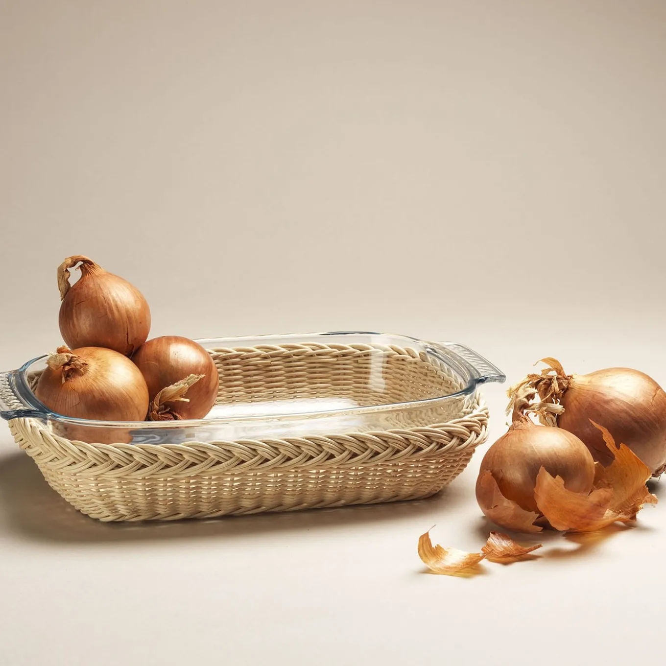 This refined wicker basket for setting the Pyrex oven pan once the cooking time is painstakingly handcrafted by master weavers. Fashioned of reeds and treated with a water-based finish that optimizes its durability, the basket allows to practically and elegantly serve food directly on dining tables. Please ask the Concierge for pricing of the variants measuring 26×19.5x6H, 29x23x6H, and 33x26x6H cm.