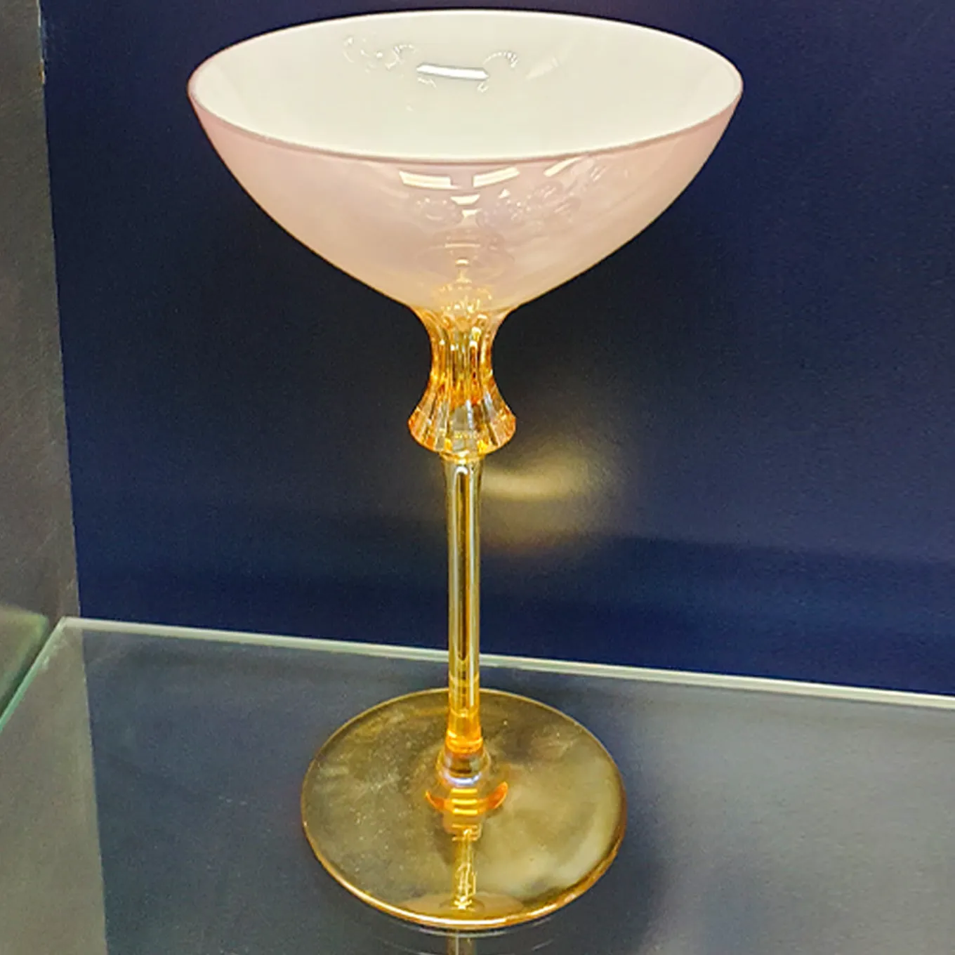 Traditional lines modern sophistication merge in this spectacular set of six champagne glasses, defined by a sublime combination of gold and pink in a stupendously polished design. Handcrafted of crystal and decorated by hand, each piece features a golden base and stem completed with sinuous and grooved upper end supporting a sleek, pink cup with a low yet generous size.