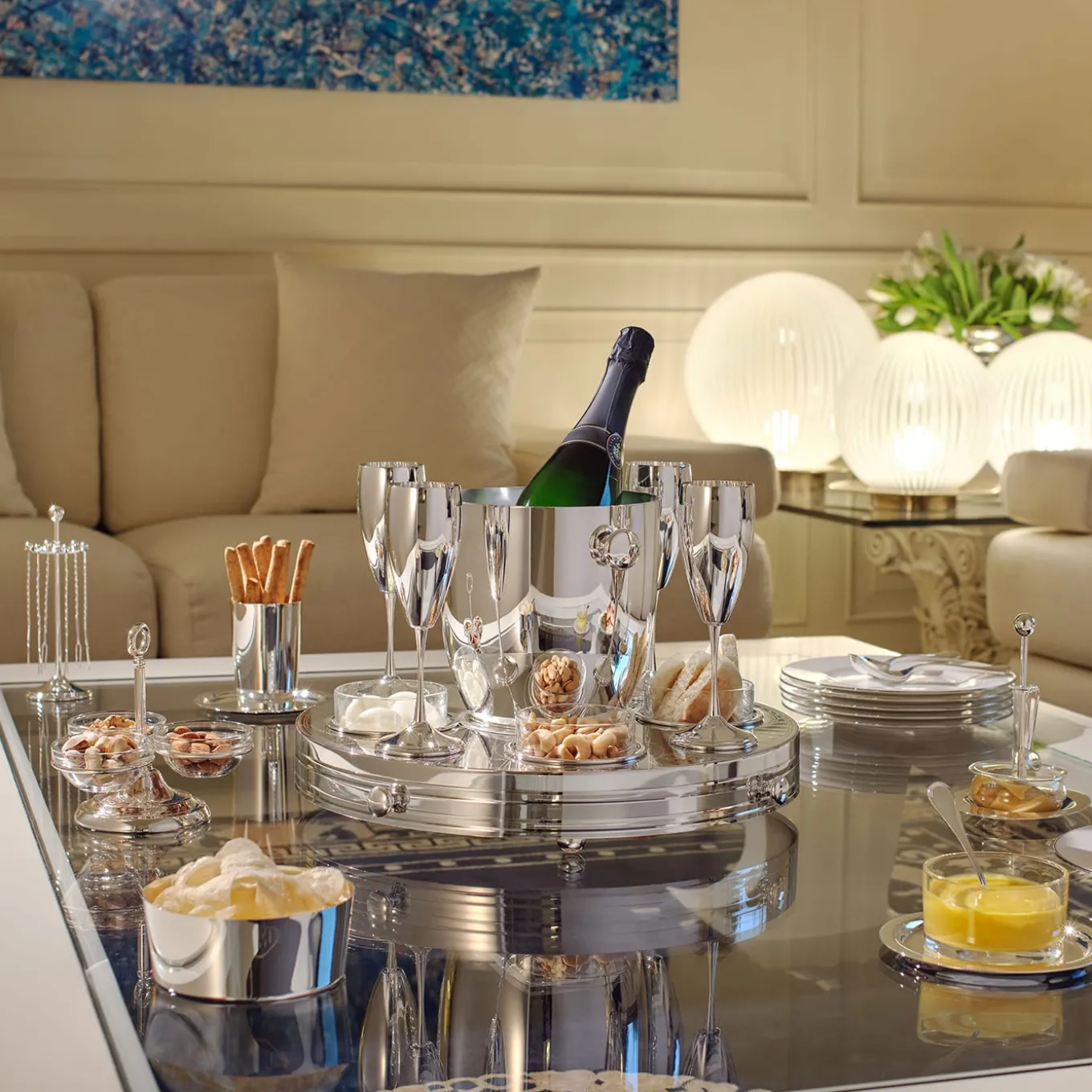 The Aperitif Set is a refined accessory to celebrate unforgettable social gatherings of any sort. The set includes: 4 glass bowls, 4 silver-plated metal flutes, and a champagne bucket. The rotating base is crafted from polished silver-plated brass and is adorned with delicate geometric engravings. Dimensions of the components: Internal size of glass bowls Ø 8 cm x h 4.5 cm Flutes h 19.5 cm.