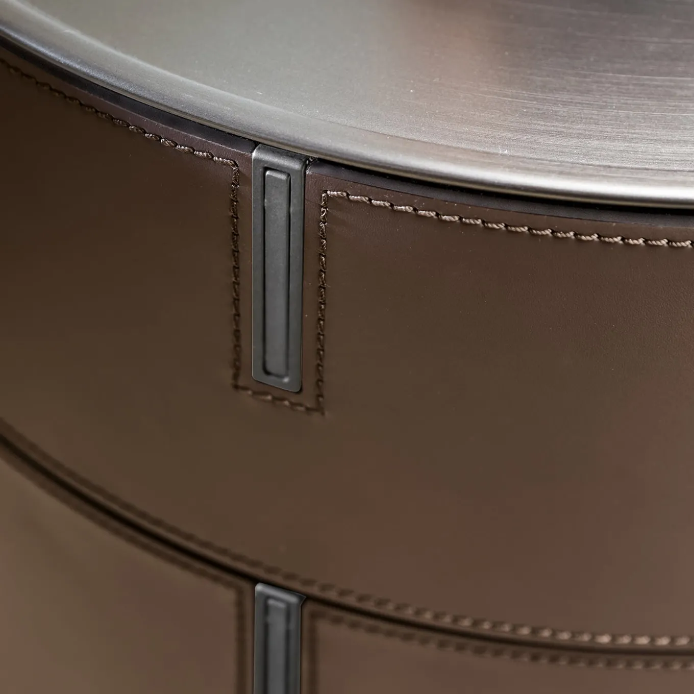 This bedside table features a steam-bent MDF structure, clad in hide with decorative stitching. Each of its three drawers slides effortlessly on metal runners, boasting hide-clad fronts adorned with decorative stitching. Completing its allure are sleek metal handles and a choice of steel trays in peltrox, bronze, titanium, or champagne finishes. Designed by Giuseppe Bavuso, this piece adds a touch of playful elegance to any bedroom setting.