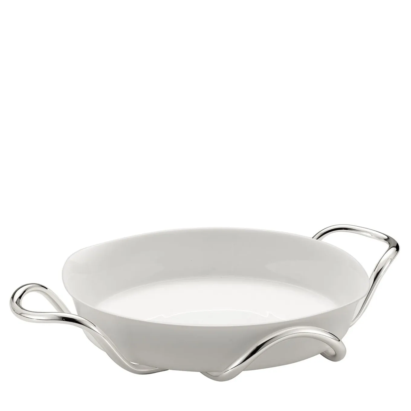 A gleaming silver plating lends refinement and opulence to the fluid-lined cylindrical brass holder for this ceramic baking dish. Practical handles are incorporated within the structure, allowing for serving food just taken out of the oven right to the table while unmistakably stating contemporary flair. Round and rectangular counterparts are available in the Artemest catalog.