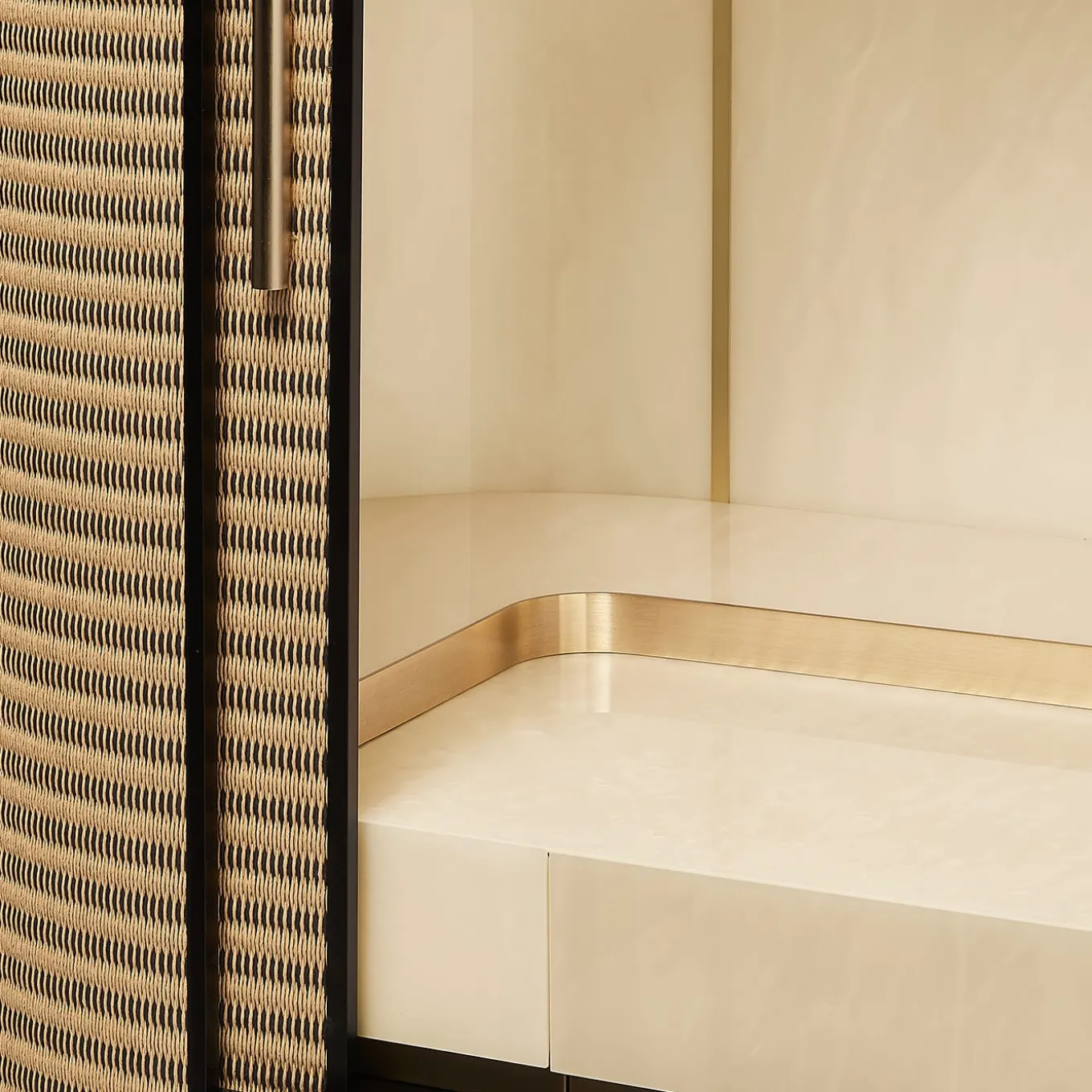 Royal Cabinet is a limited edition of 88 pieces. The structure is marked by an elongated cylindrical shape with semicircular sides, which become also the base of the furniture. The bar unit is closed by two flexible doors that slide horizontally into the main structure, unveiling the working area completed by shelves and a large drawer for preparation tools. Inside, back-lit panels of gold-toned methacrylate add movement thanks to their motif, recalling marble veins and mother of pearl.
