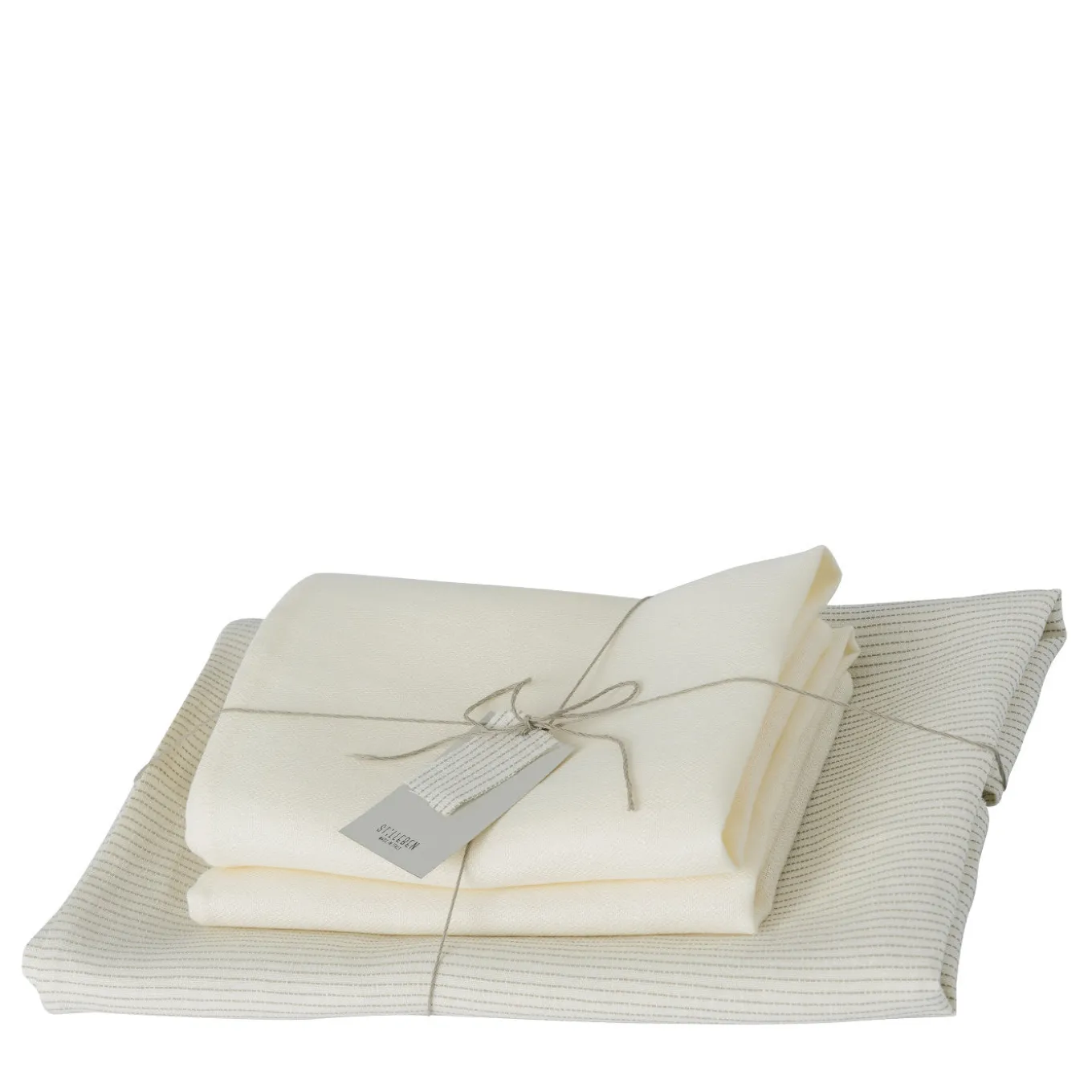 The American style Runner is made of pure hemp cloth and is extremely soft to the touch. With a pinstriped design, it can substitute a tablecloth or further embellish it when placed on top, adding an informal and carefree look to the table setting. The set consists of the runner and 2 white napkins.