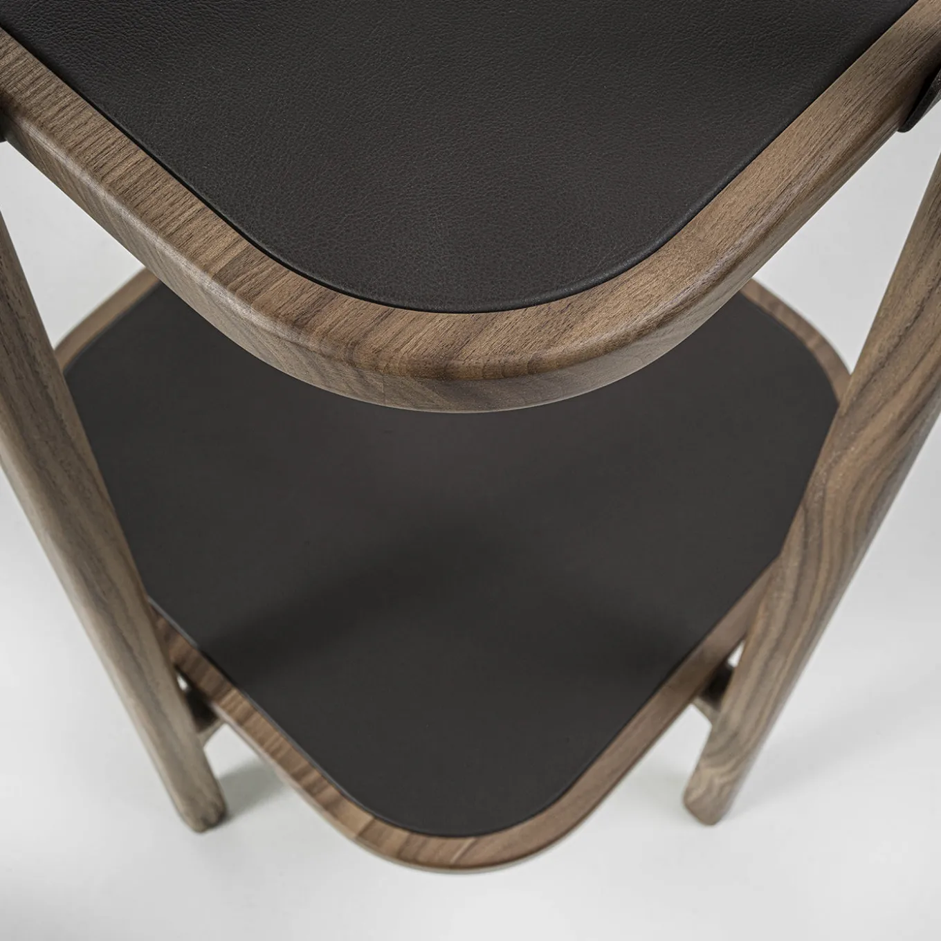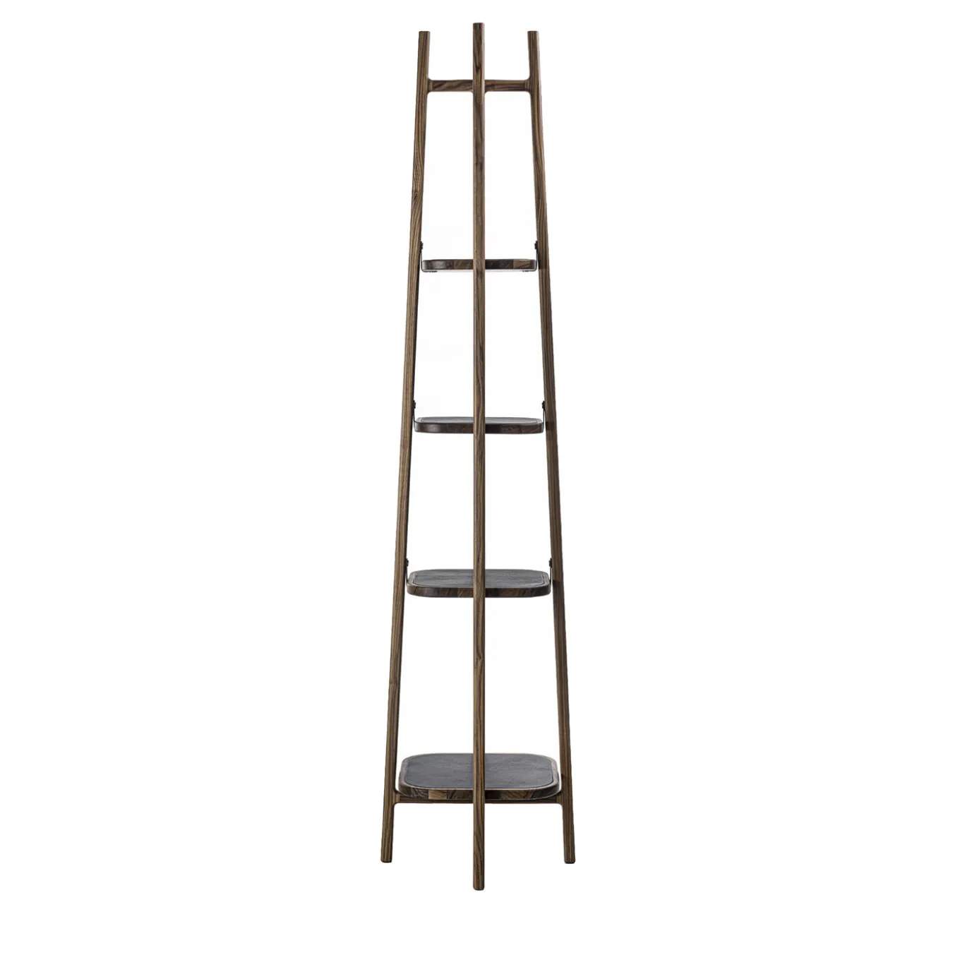 The Salina five-level bookcase in walnut wood features a refined structure with vertical and horizontal rods creating a sinuous silhouette. Each shelf is framed in wood with a leather top and supported by distinctive leather brackets studded with bronze, adding an elegant detail. This open shelving unit blends functionality with exquisite craftsmanship, perfect for organizing books and decorative objects with style.
