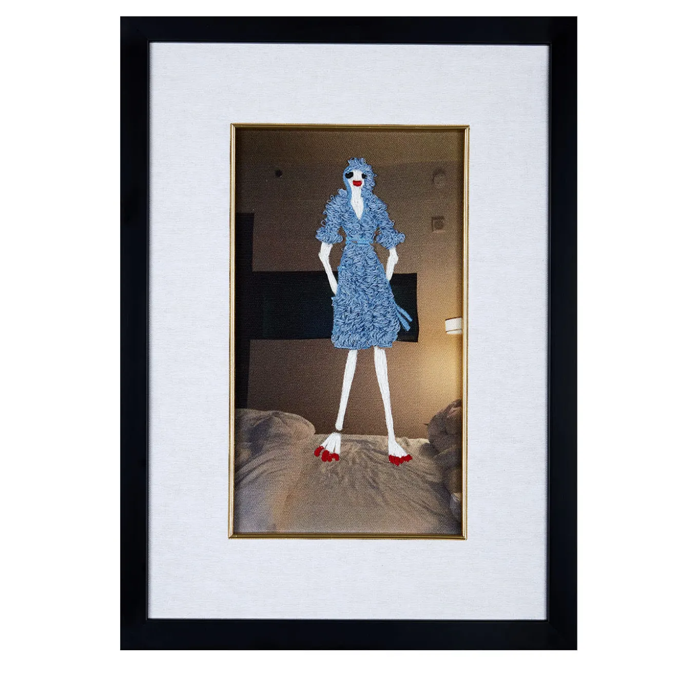 A statement of pure originality, this superb embroidery combining red satin stitches with sky-blue loop pile and cream-toned pulled thread stitches traces the silhouette of a stylish woman depicted standing still on a bed. Printed on linen, the backdrop creates an exciting and unexpected synthesis between art and reality that will surely capture the eye.