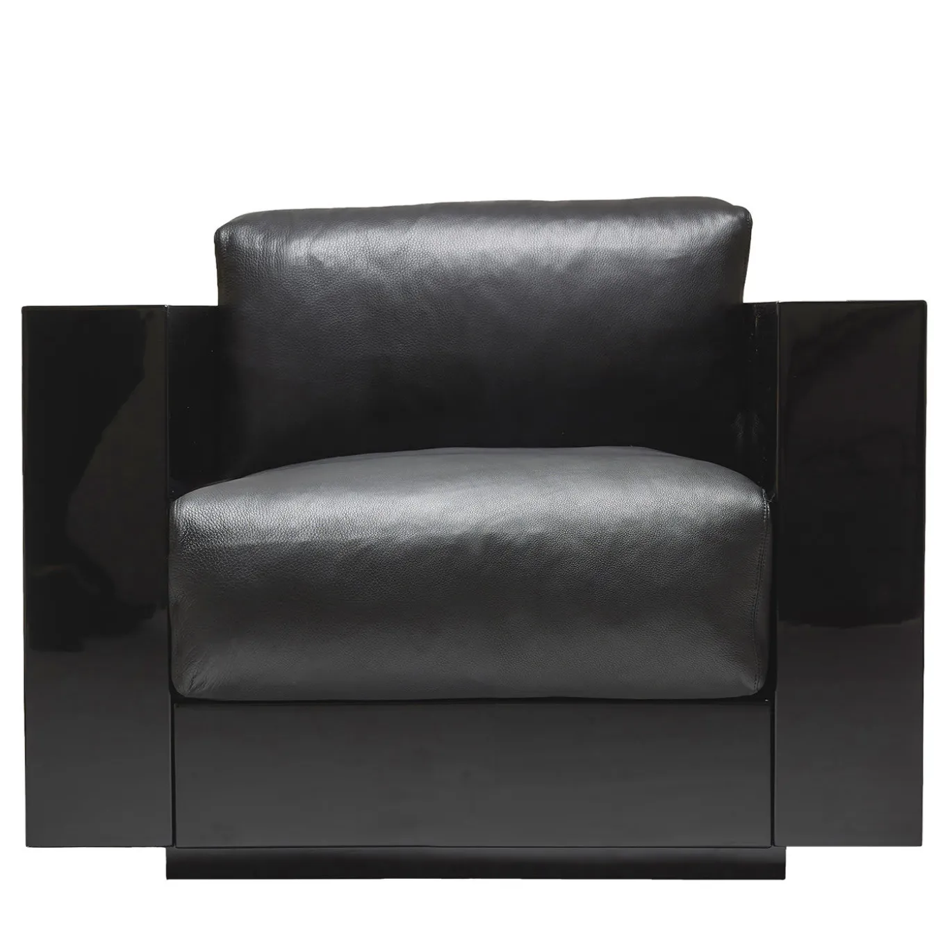 Minimalist geometry merge with refined aesthetic in this timeless, total-black armchair from the Saratoga Collections of seating solutions designed by Lella and Massimo Vignelli. Sleek and rigorous, the structure is enhanced with a stupendous shiny black polyester lacquer, matching the black color of the first-rate leather upholstery covering the softly feather-padded seat and back cushions.