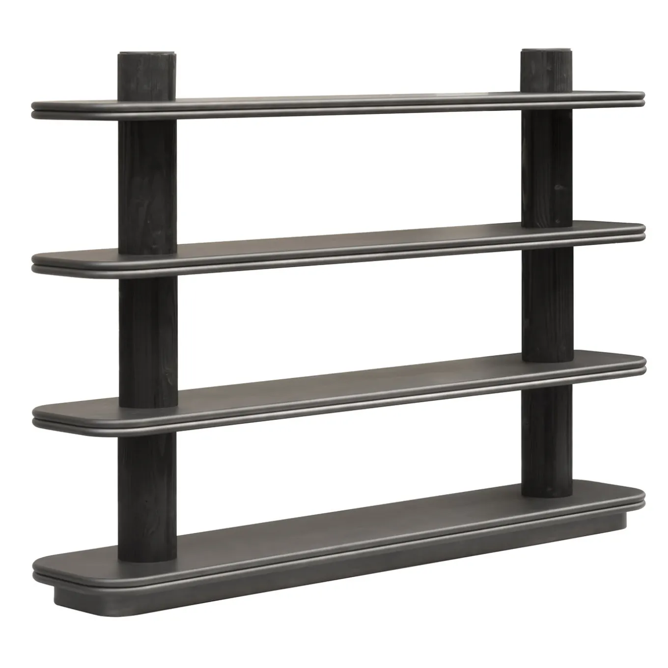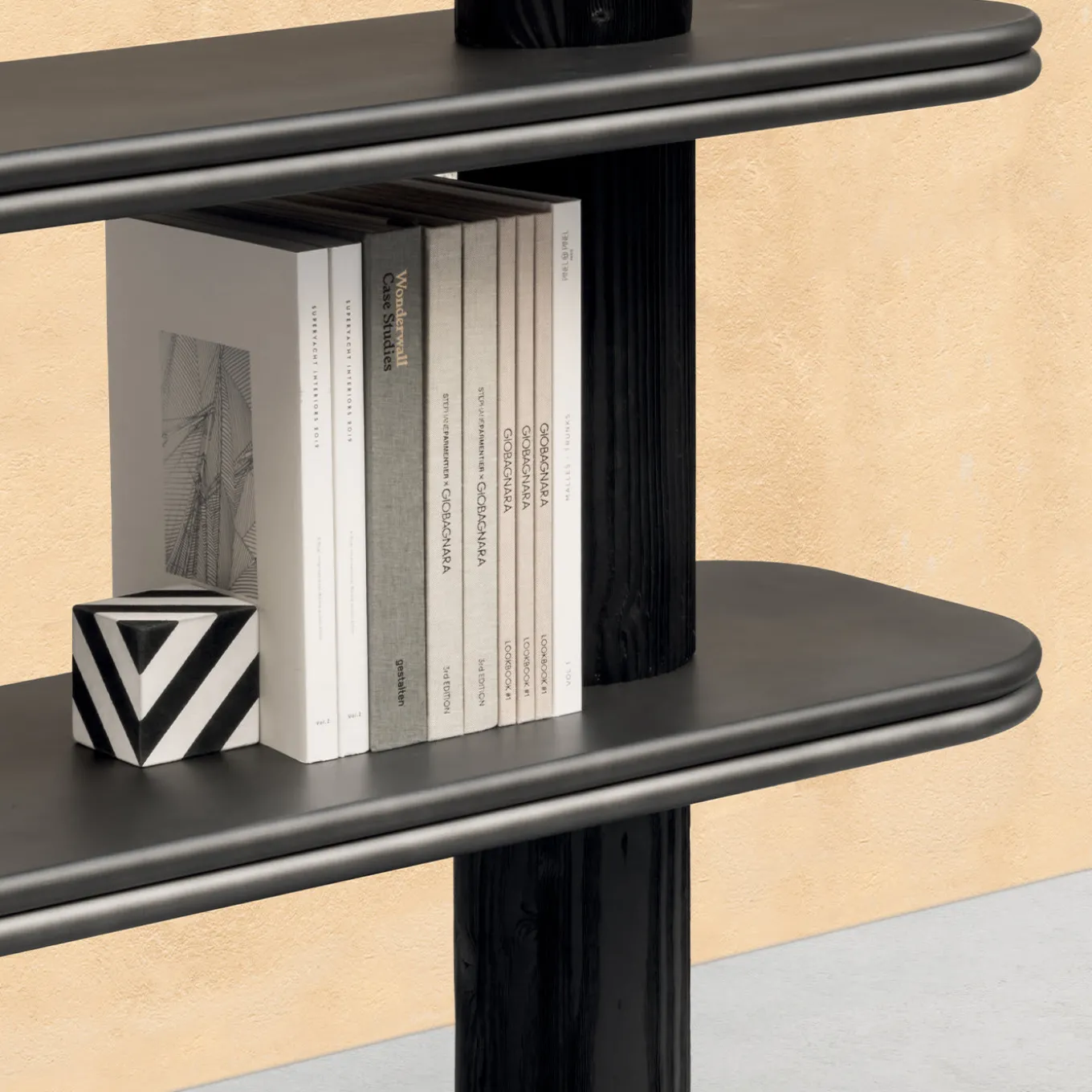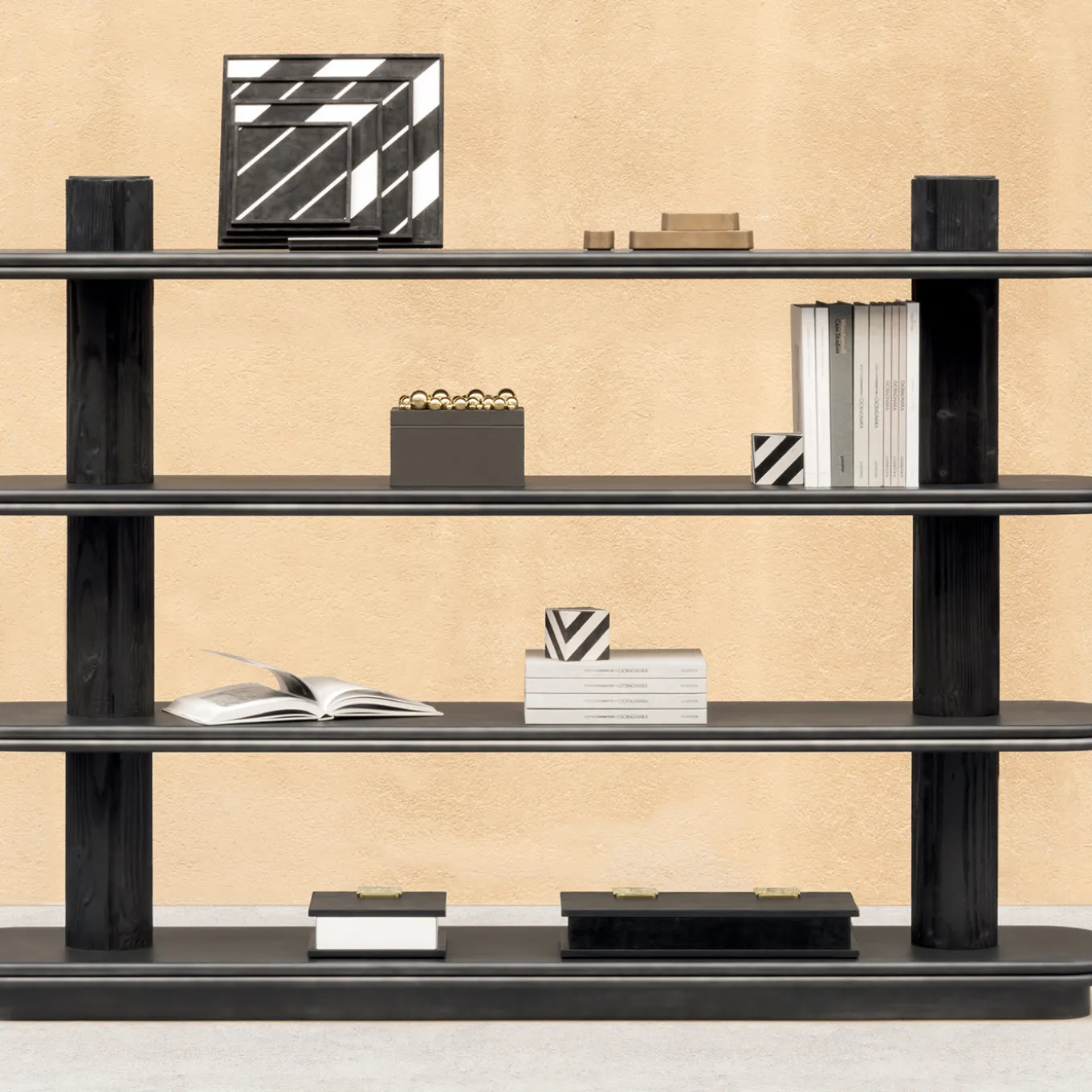Paired with other pieces from the Scala Collection, this freestanding bookcase will complete any modern interior with style. This captivating design exudes geometric intrigue with its straight lines and open construction that combines dark-lacquered wood for the vertical supporting poles and bronze-colored leather for the rectangular base and shelves.