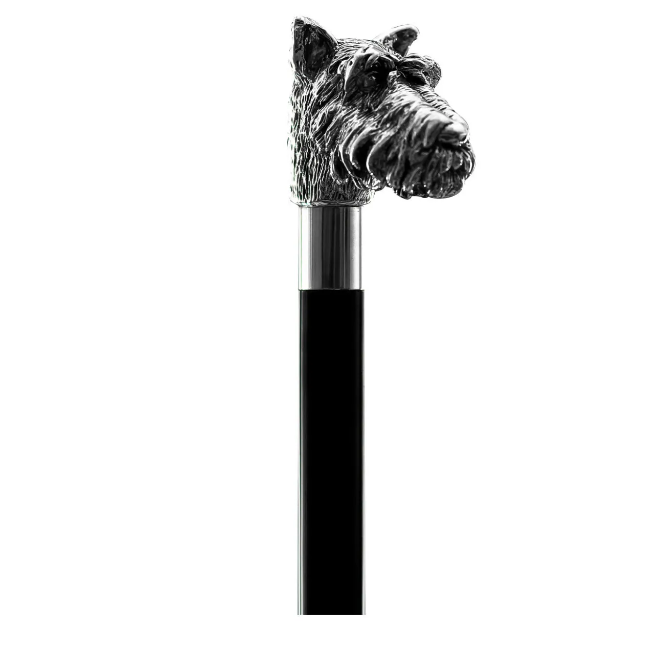 Characterized by an elegant and classic design, this stick features a metal handle richly decorated with elegant patterns embossed on the surface. The conical shaft of this sophisticated accessory is crafted in gloss black beech wood and has a silver-plated brass tip with protective rubber end. This is a collectible item, not to be used for walking.