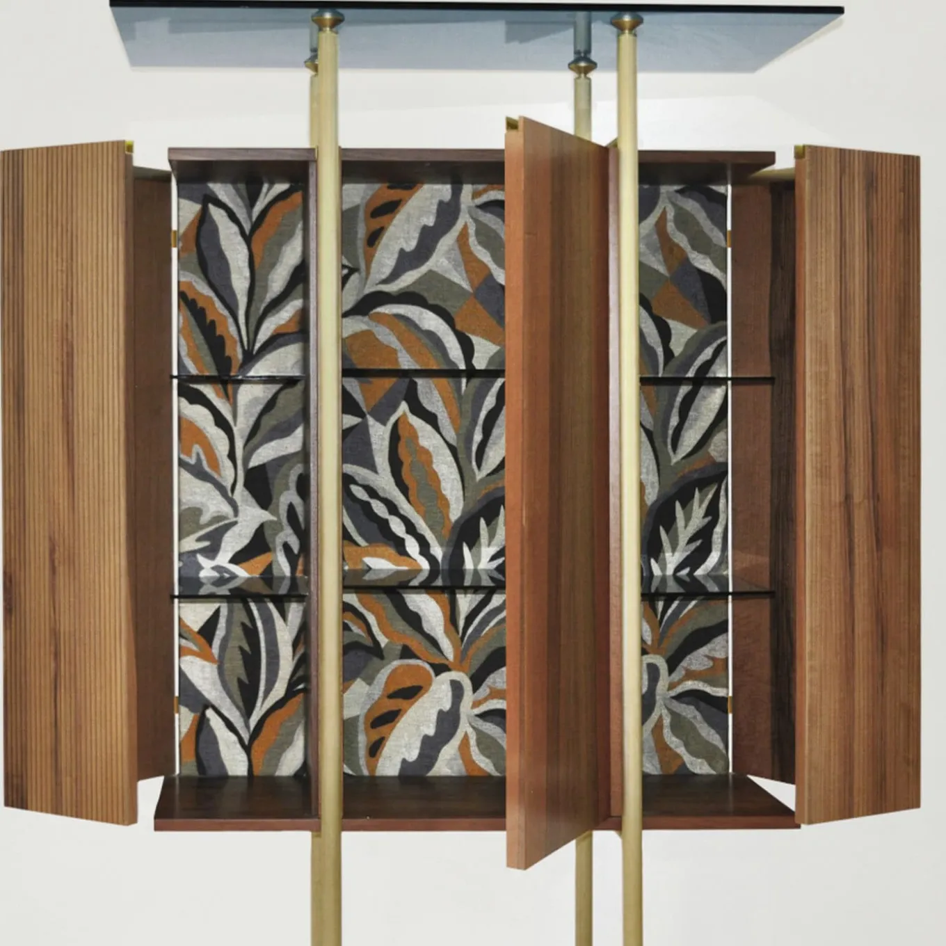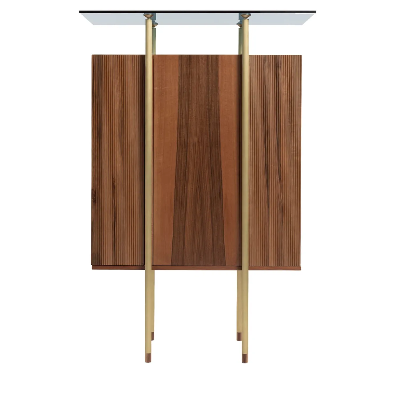 An exclusive and elegant furniture piece that draws inspiration from ancient trunks, this cabinet is an eclectic design that will make a stately addition to a contemporary interior. It features a ribbed, cylindrical brass structure and a Canaletto walnut body, enhanced with a colored glass top. Inner shelves are made of clear glass. It is customizable with a fabric-upholstered interior for a price change, please ask for details.