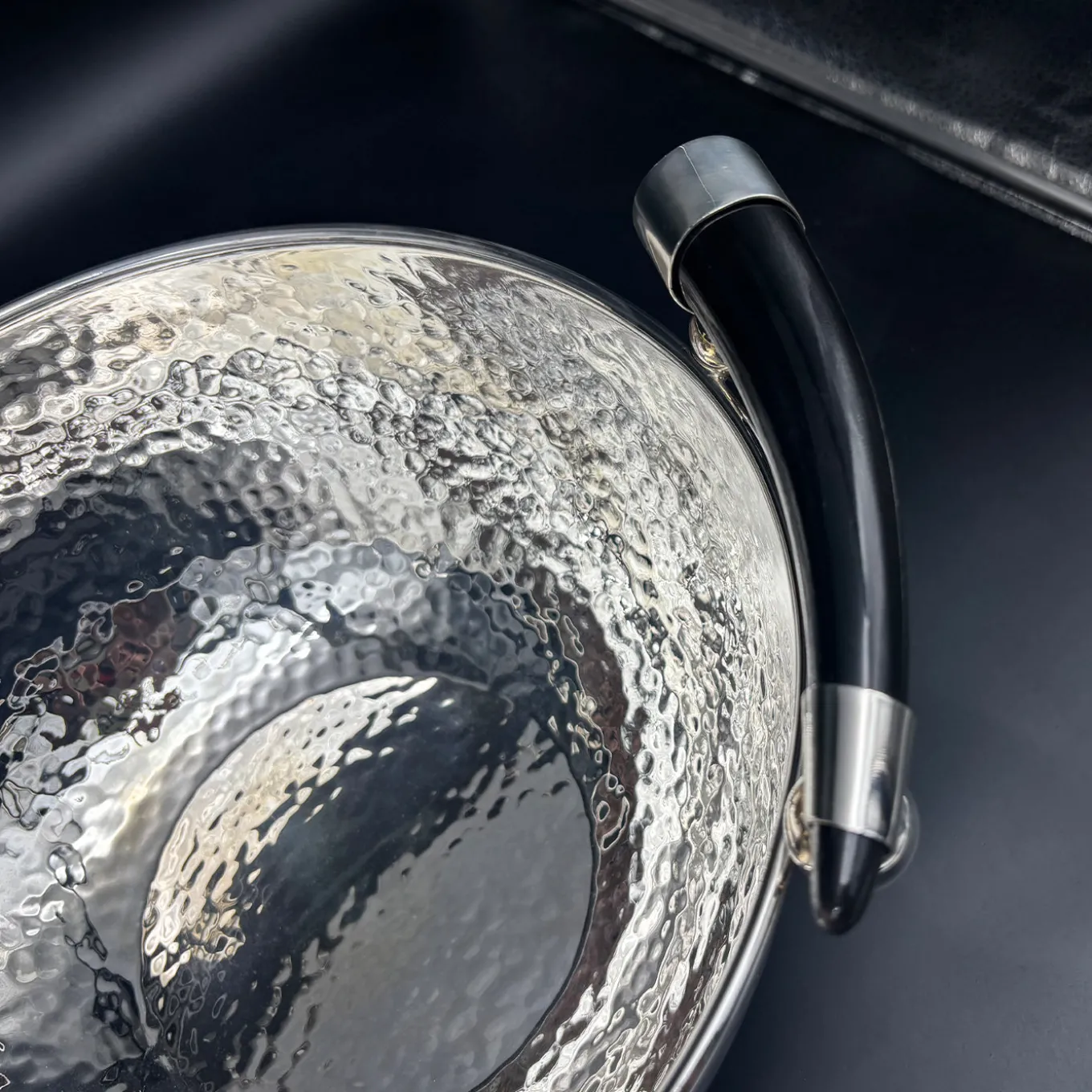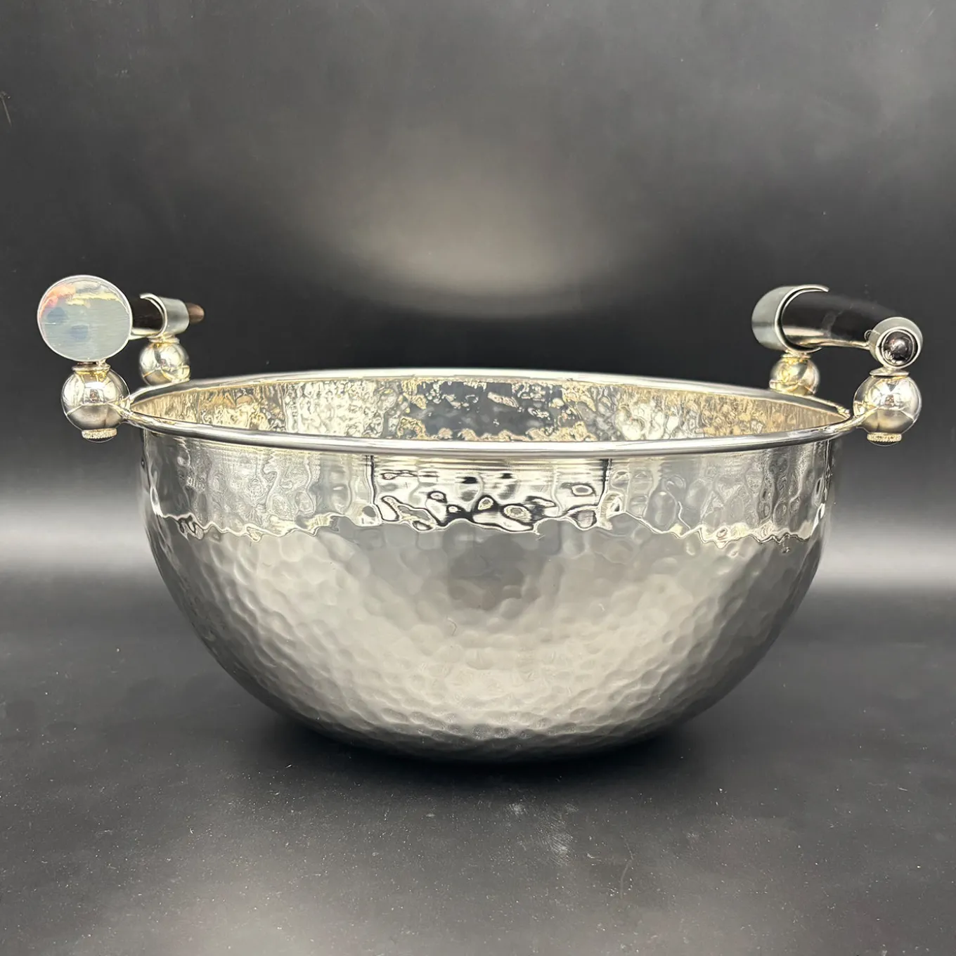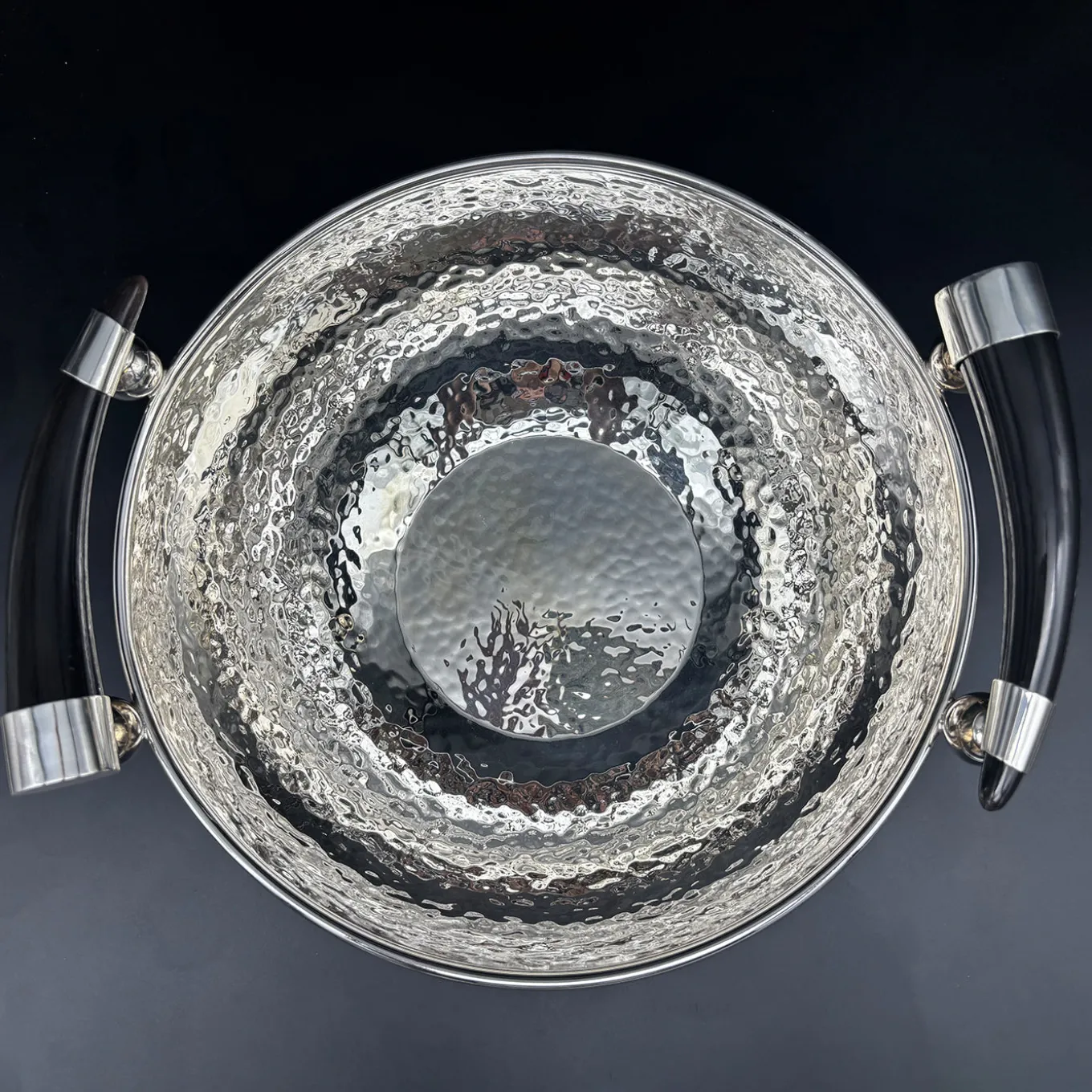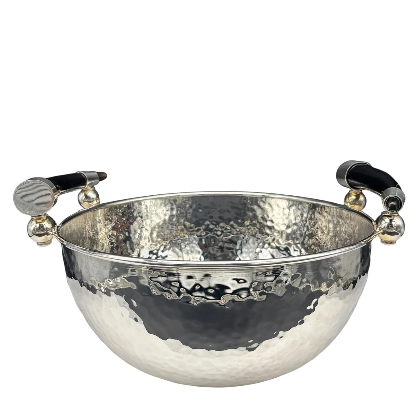This superb bowl is a glamorous decorative accent that will look equally stunning on a dining table to hold fruit or on an entryway console with a bouquet enlivening both modern and classic decors with its timeless design. Part of the Horn Collection, the generous round silhouette boasts a shimmering hand-hammered finish and two black horns placed on the rim as decorative handles. This sleek yet sophisticated bowl can be displayed with other pieces from the same collection for a cohesive look that will not go unnoticed.