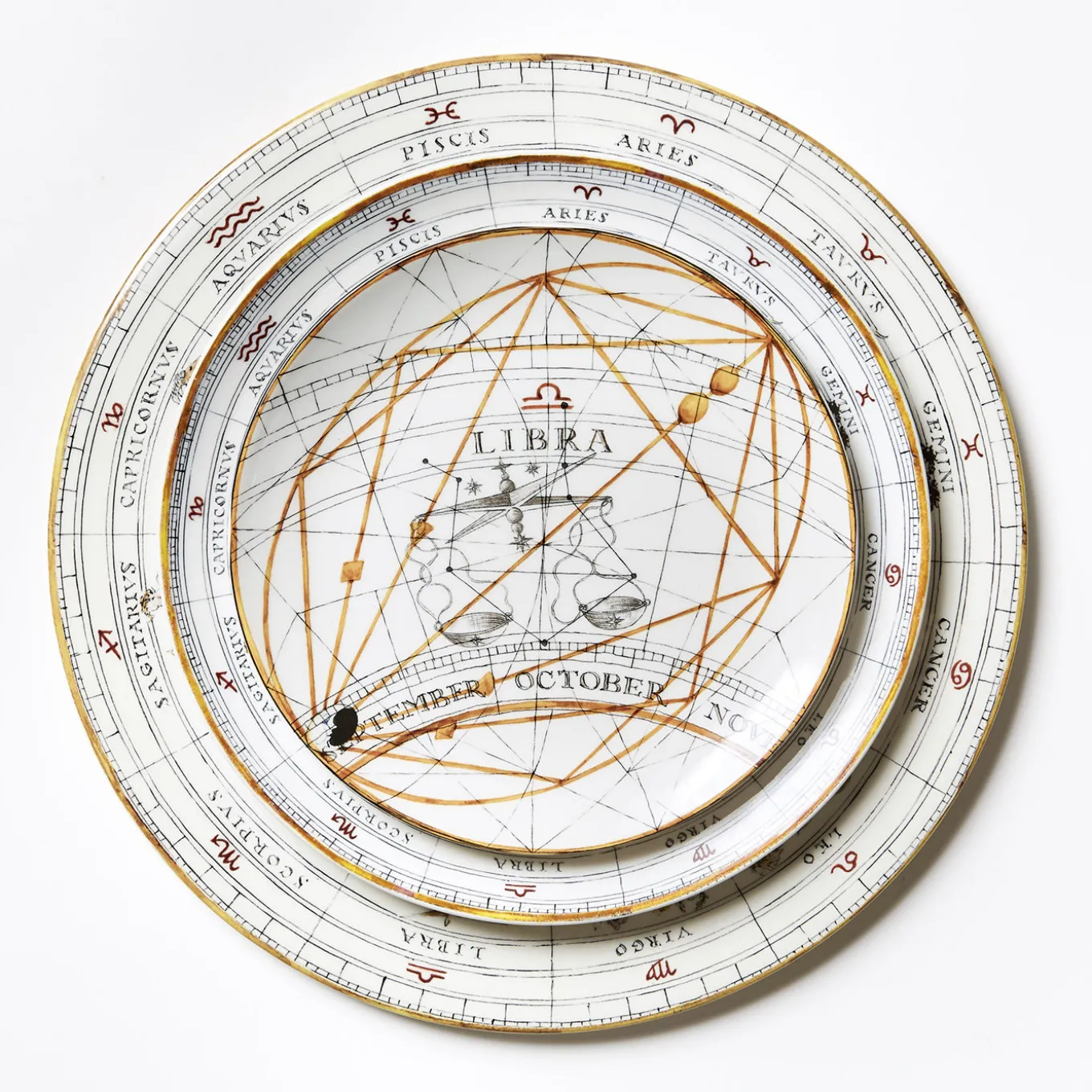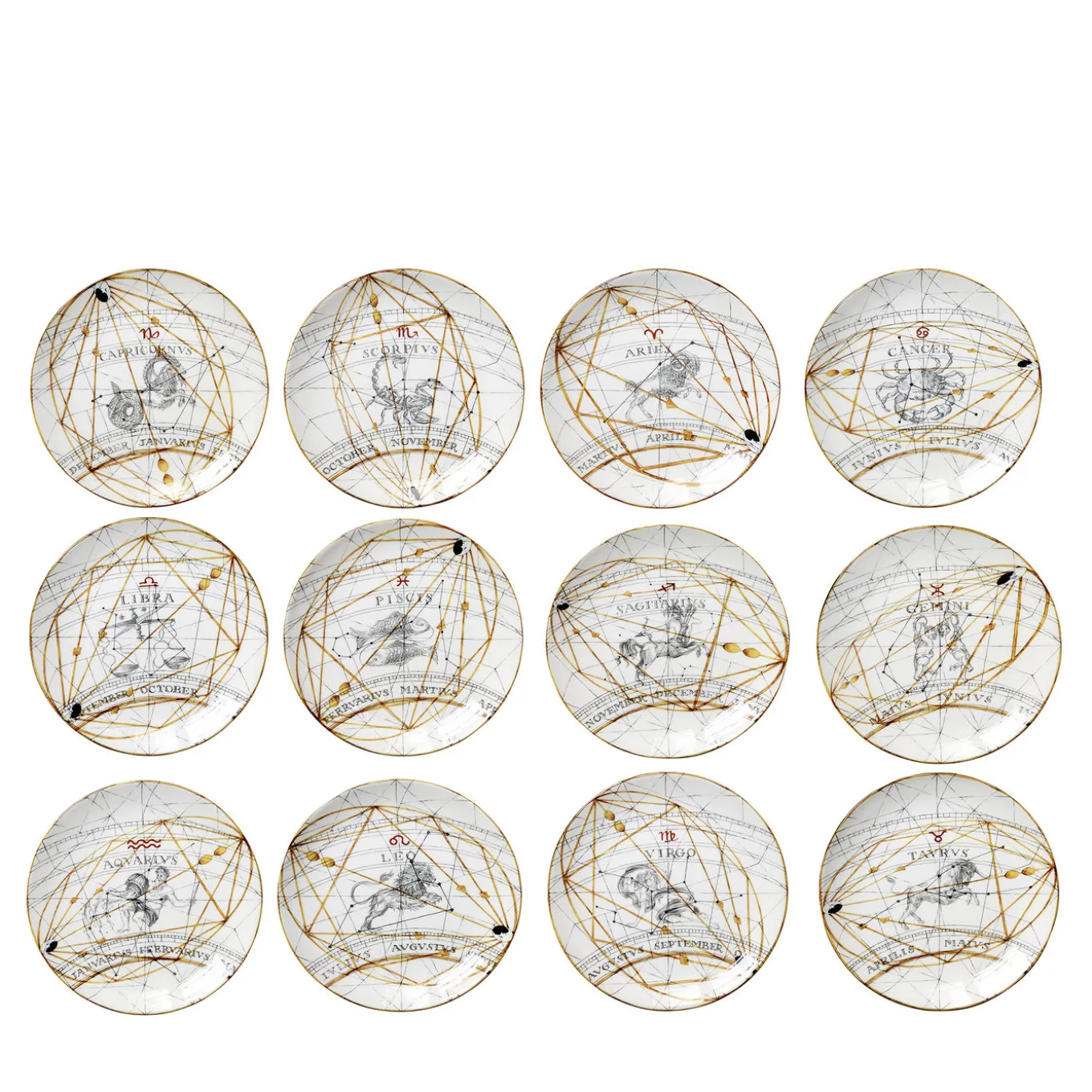 The twelve signs of the Zodiac navigate the astral geography along with their celestial coordinates, and a thirteenth element brings them together in a complete circle on the edge of the plate. Embellished with stellar gold patterns, they are an irresistible attraction for astrology enthusiasts, those who love the stars, and those who do not read horoscopes but are fascinated by the sky and the night.
