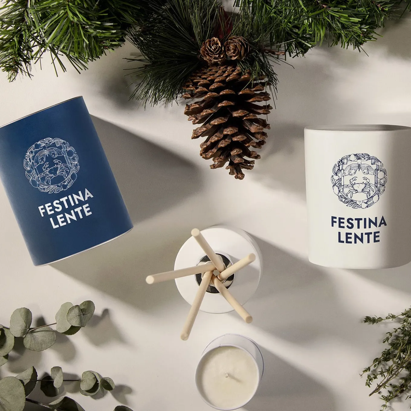 This candle is poured by hand in a white glass container with a glossy white finish printed with the Festina Lente Home logo in black, inspired by the symbols of the crab and the butterfly first appeared on gold coins minted for emperor Augustus in ancient Rome. The capacity of 220 gr (7.7 oz) makes for a total burning time of 45-50 hours. The candle comes in a container with a metal pressure lid. The wax is 100% pure soy wax with no GMO. All the fragrances are vegan, cruelty-free, and phthalate-free. The wick is in cotton and paper. Borea (North in Latin) is reminiscent of fragrant fir and fresh resin. The dark of the afternoon has the scent of fir needles and resin, among notes of eucalyptus and pinecone. It invites us to take deep breaths in between words suspended in white clouds. The brisk air reddens our cheeks while the newly fallen snow creaks under our steps. Everything is silent, illuminated by bright winter stars. Olfactory pyramid: Head: white mint, lemon; Heart: green resin, thyme; Base: cedar wood, fir needle.