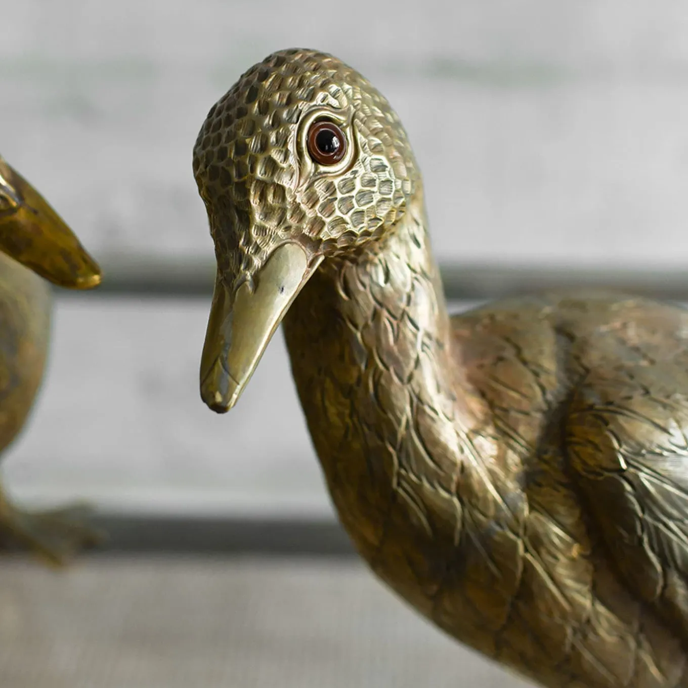 Experience the elegance of handcrafted artistry with this exquisite set of two brass duck sculptures. Each piece is meticulously crafted using the traditional techniques of embossing and hand-chasing, resulting in remarkable texture and intricate detailing. The outstanding craftsmanship highlights lifelike features, capturing the natural beauty and character of these charming creatures. The careful hammering and engraving processes create depth in the design, enhancing the visual appeal of the feathers and form. Each figurine is uniquely stamped with the Molto Collectibles mark, ensuring authenticity and quality.