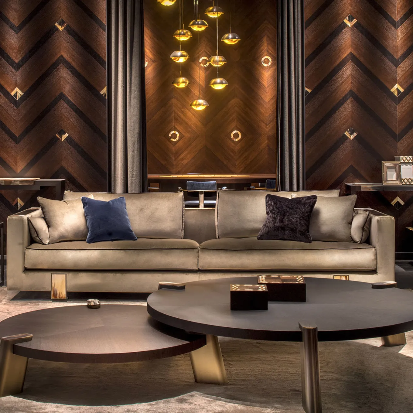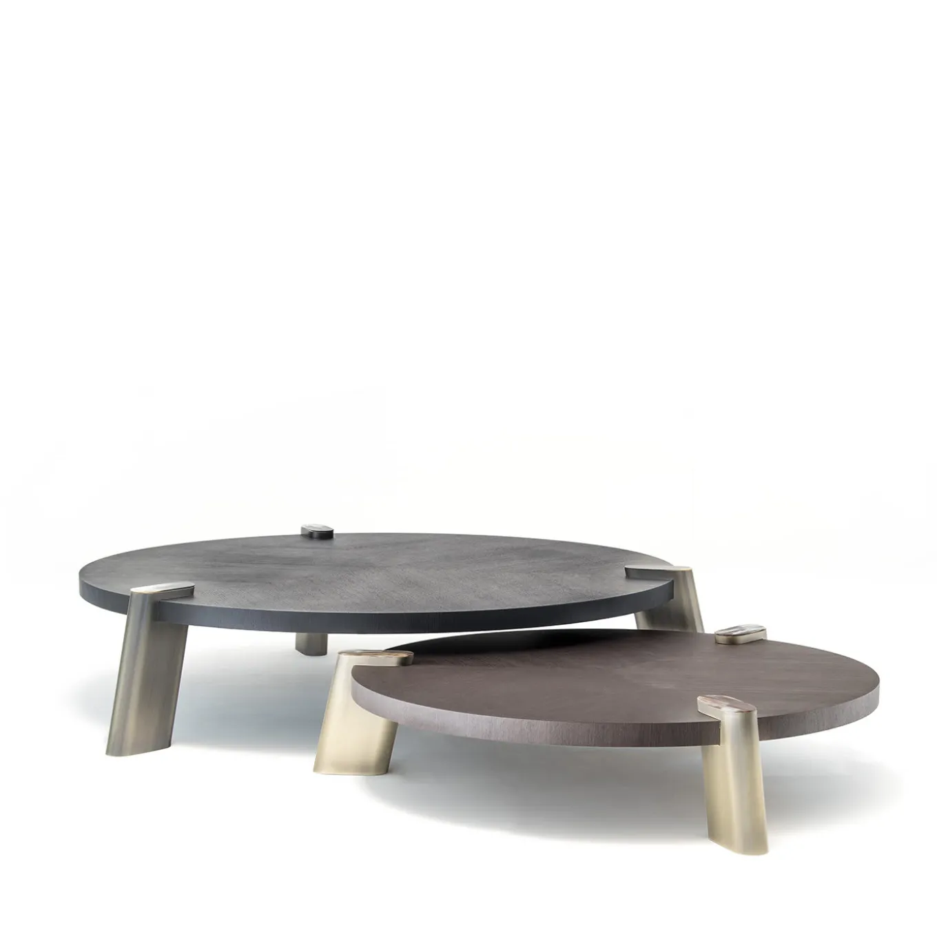 Defined by simple geometric lines, the striking elegance of these two coffee tables is all in the rich details. A stately round top in oak wood sits atop three slanted rectangular brass feet with rounded edges accented on top with natural horn. The tables feature coordinating finishing for wood and metal: the large one (160 cm diameter) has a black top and burnished brass-plated stainless steel feet, while the small (120 cm diameter) has a tobacco finish and satin brass-plated stainless steel feet. The interlocking setting of the legs adds a modern feel to these tables that can be displayed together as nesting set or separately.