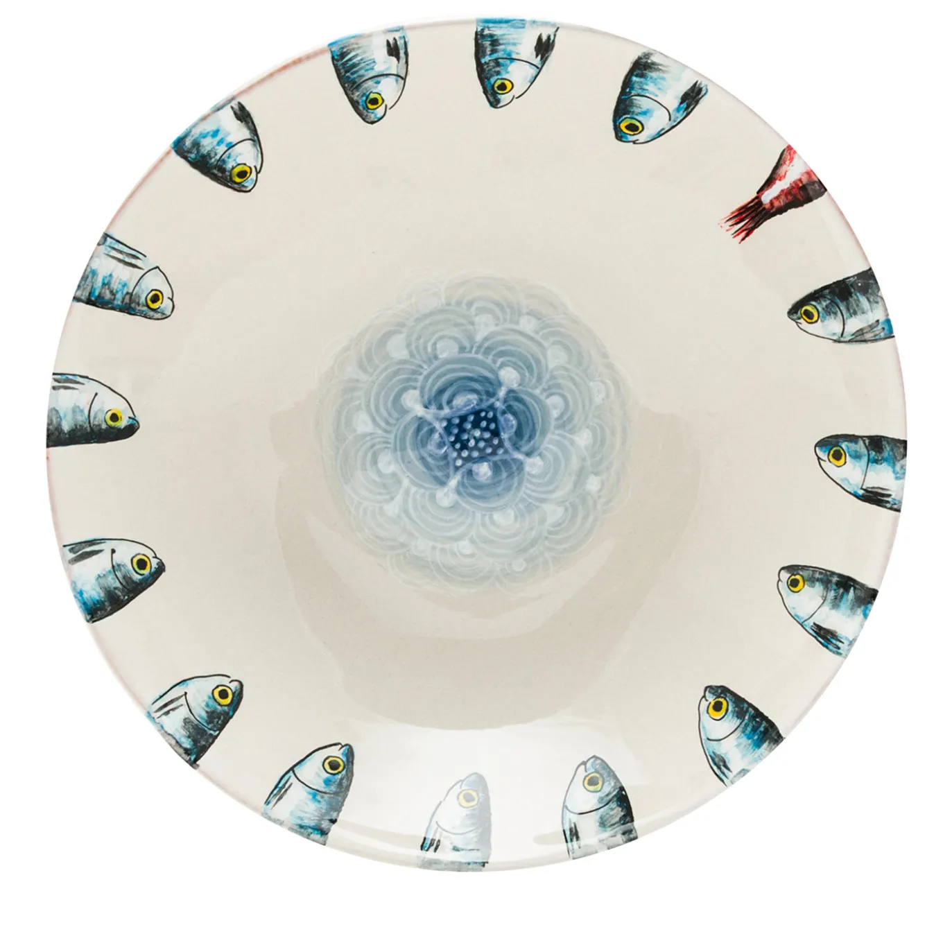 This ceramic soup plate features a hypnotic decoro pattern, ideal for serving salad, pasta, or soup. Its medium size balances functionality and style, showcasing a unique design with fish motifs around the rim and a decorative floral-inspired center. Suitable for adding an artistic touch to various dining settings.