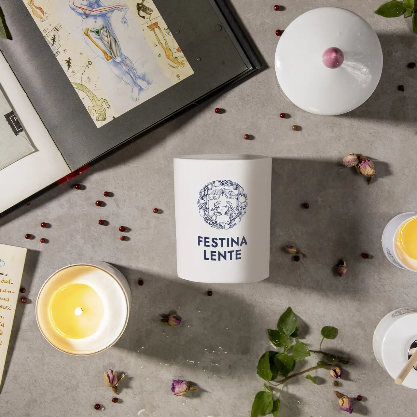 These candles are poured by hand in a white glass container with a white finish printed with the Festina Lente Home logo in black, inspired by the symbols of the crab and the butterfly that first appeared on gold coins minted for emperor Augustus in ancient Rome. The wax is 100% pure soy wax with no GMO. All the fragrances are vegan, cruelty-free, and phthalate-free. The wick is in cotton and paper. Olfactory pyramid: head rose, cloves heart cinnamon, patchouli base amber, sandal wood, musk.