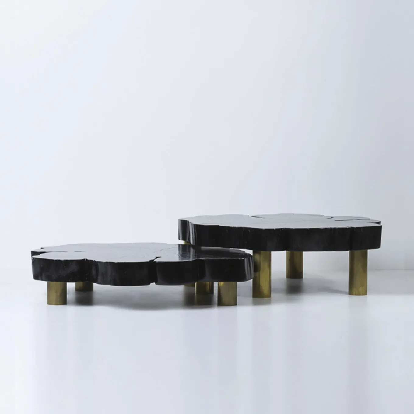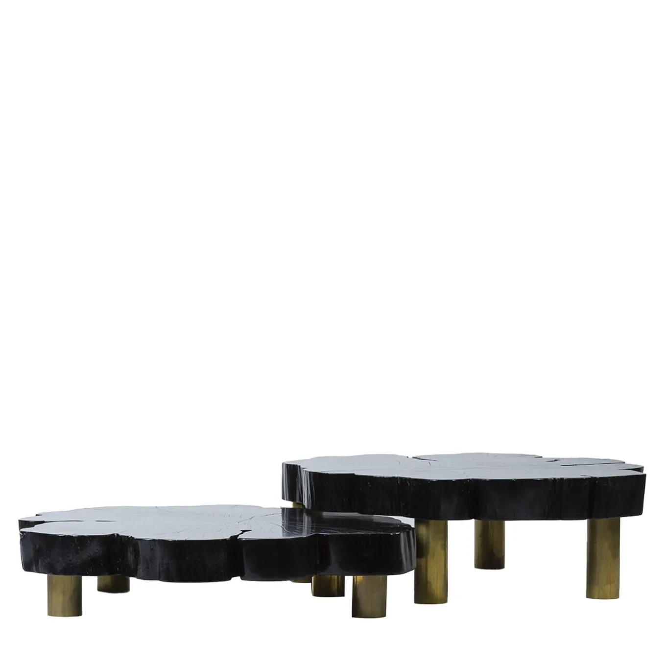 A naturally treated rustic silhouette creates a piece that stands out for its unique simplicity. Obtained from an authentic part of a century-old cypress tree, this pair of coffee tables naturally sports precise details and fissures enhanced by applying black lacquer on the sides. Finally, it is the natural brass feet that give the ultimate touch of classic and exceptional elegance to this piece of furniture