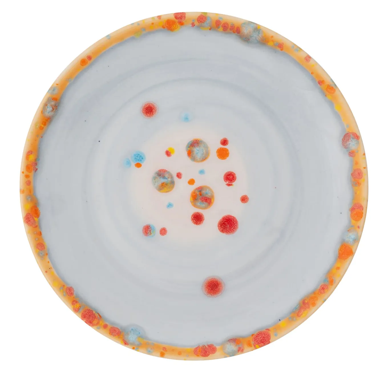 The Murrine Gray Dessert Plate is a stunning piece inspired by the vibrant artistry of Venetian glass, reminiscent of intricate kaleidoscopes. Its soft gray hue brings an elegant touch to any setting, embodying sophistication and serenity. The design features Murrine patterns that gracefully open and disperse along the edges, resembling colorful flower seeds in gentle motion. Part of a collection that includes yellow, green, and lilac.