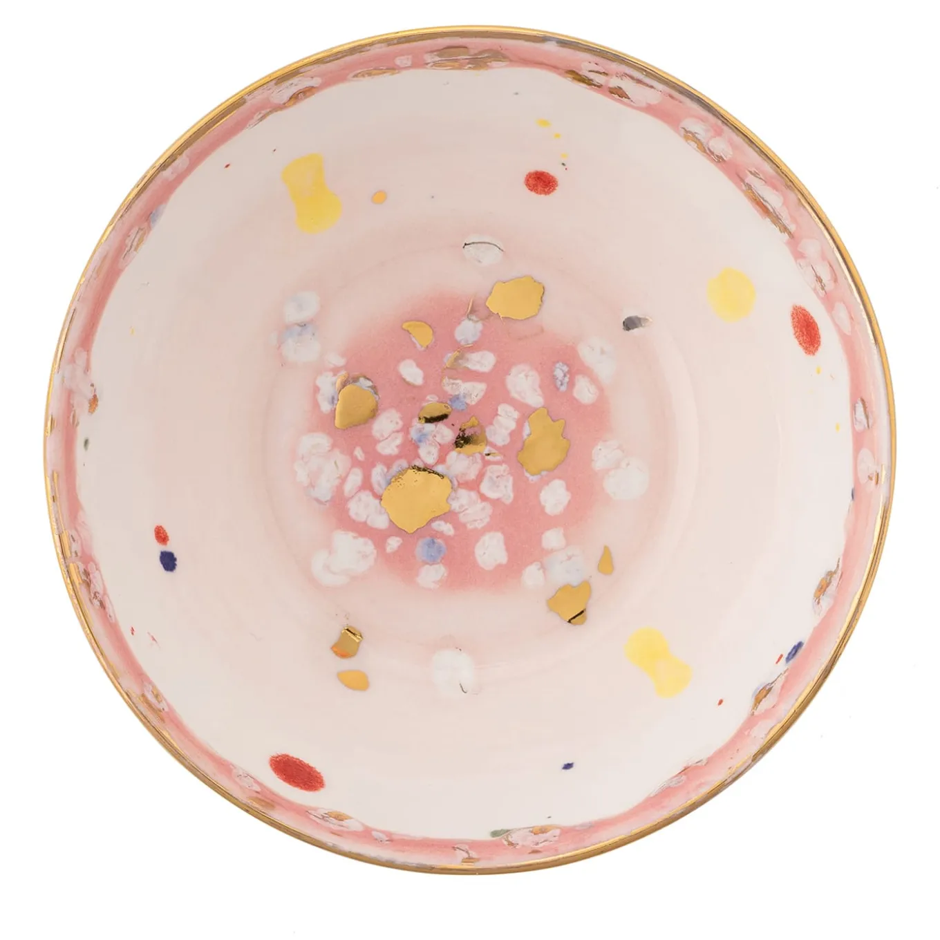 The Palm Beach Fruit Bowl from the Florida collection is a stunning blend of luxury and cheer, launched in 2023. Inspired by the vibrant spirit of Florida, this bowl features a radiant Palm Beach pink that evokes the beauty of its beaches and sunsets. Its lightly colored center is adorned with multicolor dots, adding a playful touch. The rim is elegantly decorated with golden leaves, enhancing its opulent appeal.