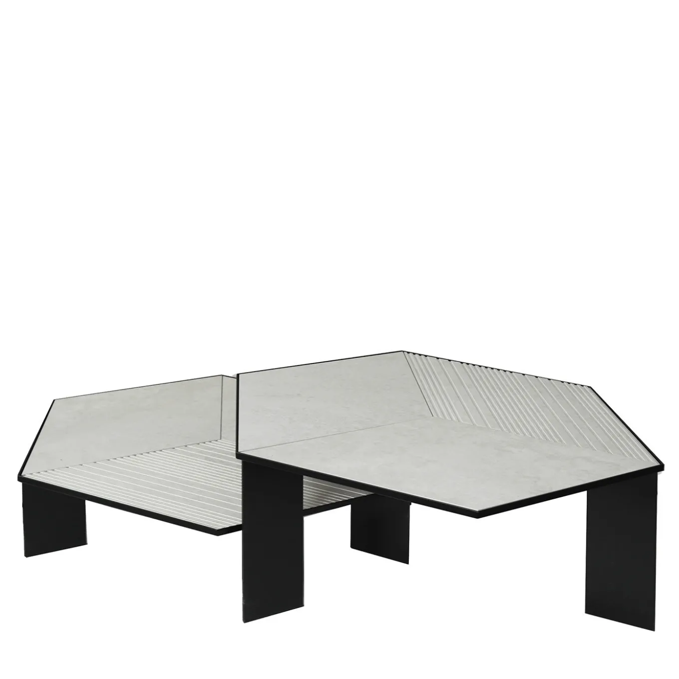 “Yso” is a small hexagonal table set that could be juxtaposed or overlapped to create amazing geometric composition. The structure is available in black or brass painted iron, while the top is made with white stone porcelain tiles with special surface milling effect.