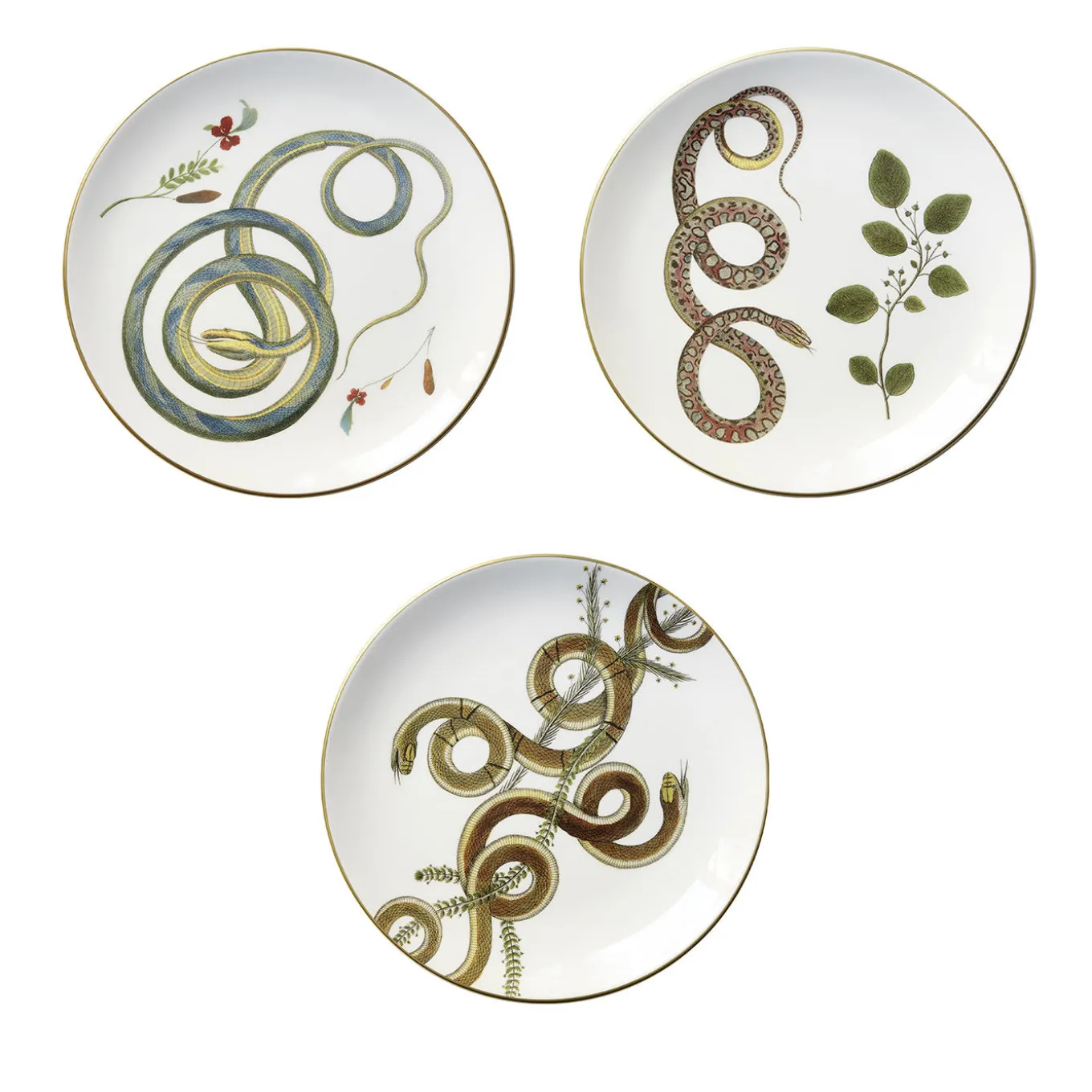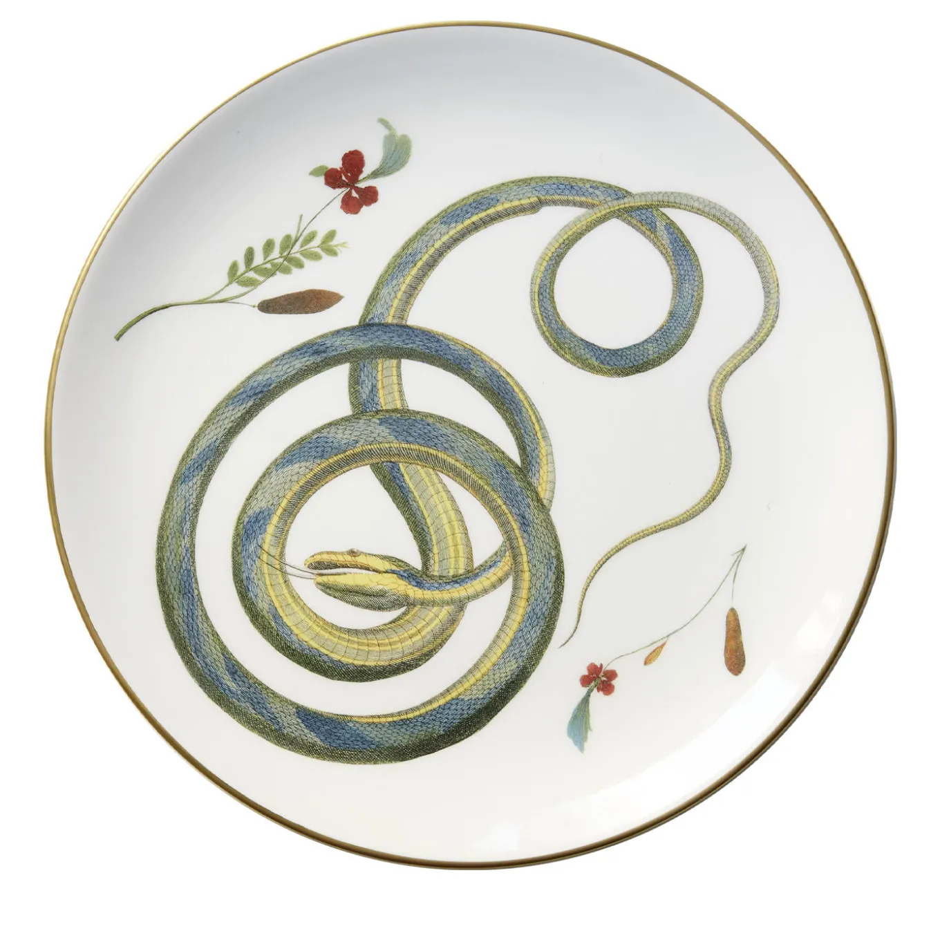 No words are required in front of the enchanting magic of snakes: their coils stand out on the white of a plate or wrap sinuously on a garnet red background. The gold on the edge, whether in the form of a thread or a band, emphasizes the intricate preciousness of this intriguing Collection. Whatever choice is made, this series will undoubtedly dominate the conversation for an entire evening. Allow yourself to be enchanted.
