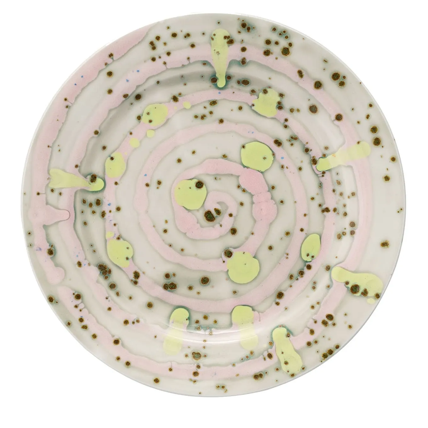 A refined set of four dessert rim plates in rich shades of green, featuring dynamic pink spirals that radiate from the center, drawing in bright green and black speckles�evoking the essence of the countryside at harvest time. This exquisite design is also available in an alternative version, showcasing a delicate pink enamel finish, a soft light green center, and elegant green accents for a sophisticated seasonal touch. Contact the Concierge for additional information.