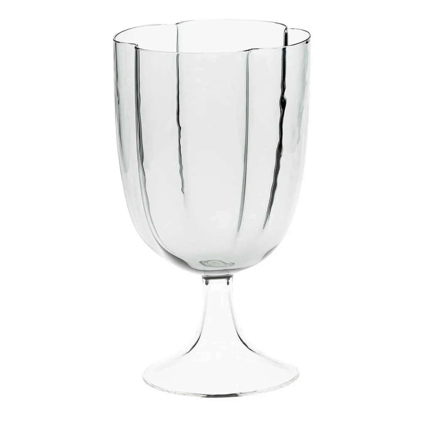 Set of 4 transparent wine glasses with a flower shape and stem, the glass opens like a flower in 4 petals. The glasses are handcrafted in Venice. They’re very light in weight, nuance and glass quality, but very resistant. It’s possible to wash them in the dishwasher. Also available in other finishes, please contact the Concierge for further options.
