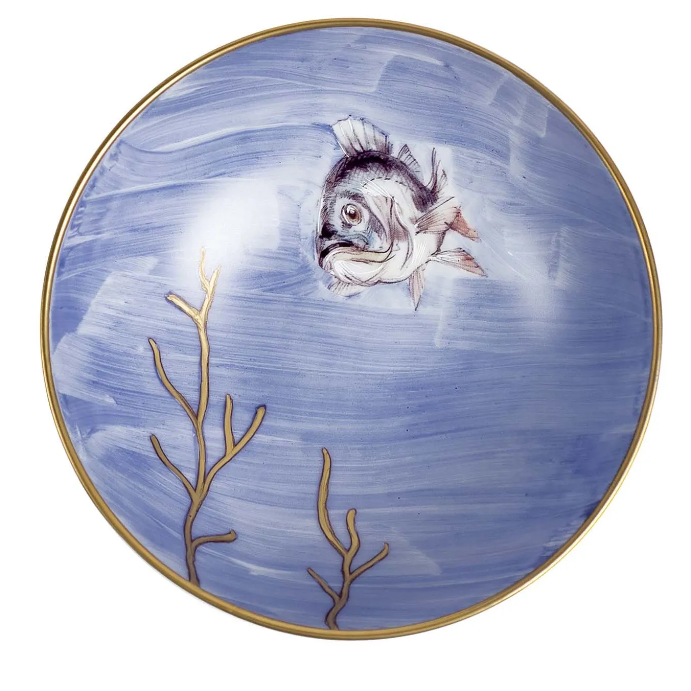 With a dreamy cerulean background with visible brushstrokes, this set of four small porcelain bowls comes from the Stella Fatucchi Pesci Collection. Painted completely by hand, with the exception of the fish, the coral is accented with real gold. Any slight difference or imperfection is testament to the artisanal process.