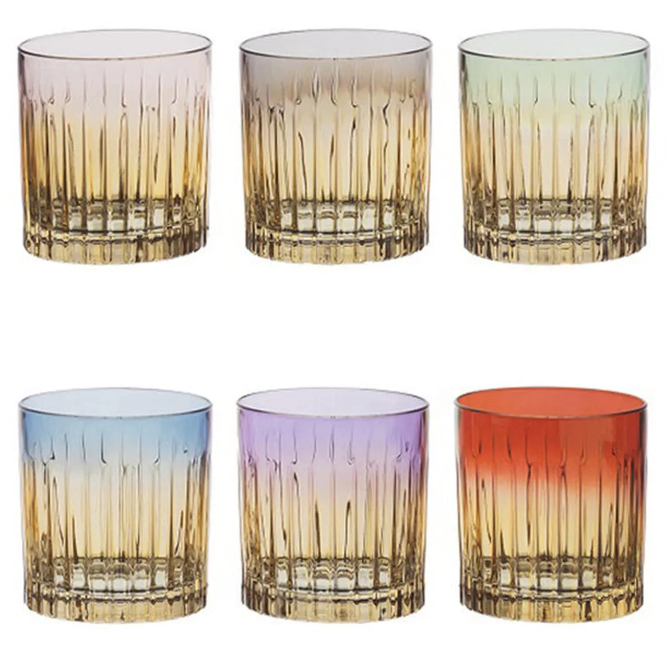 All the glasses in this set feature a unique ombre color pattern. Each one has its own unique shade at its top which diffuses into a smoky transparent shade at its bottom. Each glass is made by hand.