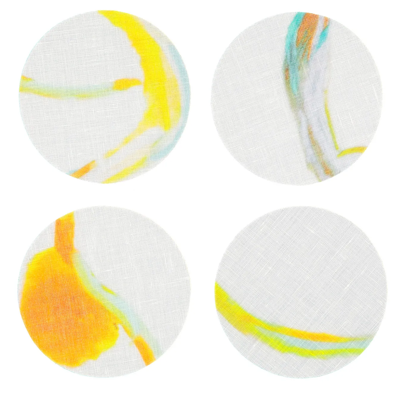 This original Luisa Longo hand-painted artwork has been digitally printed on linen, each piece is cut from a very large motif so all the mats will be different from each other, forming a unique table setting. The fabric has been embedded in an exclusive polyurethane solution with the softest peach skin feel. The coasters have an extraordinary resistance to heat, abrasions, and stains, light and totally flexible, can be washed just with a drop of water and soap.