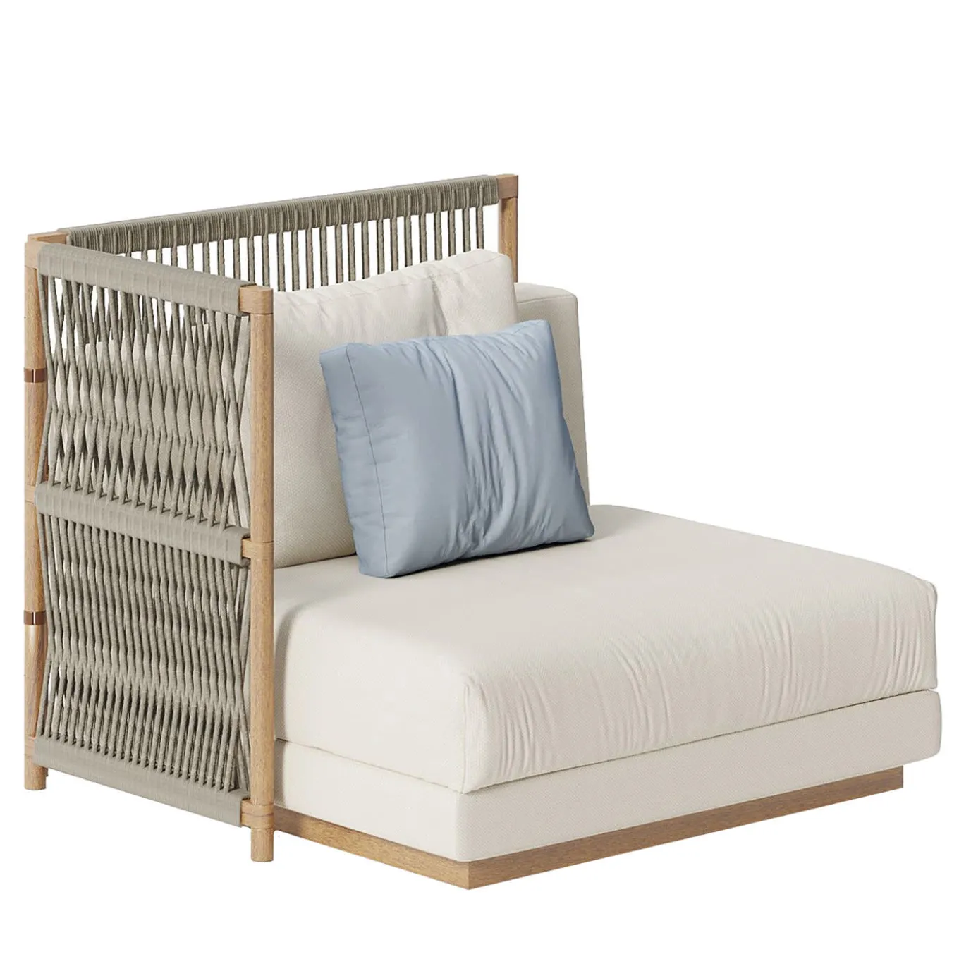 A hypnotizing pattern of interlaced taupe ropes graces the linear Iroko frame of this angular sofa, part of a modular system suggesting multiple compositions to be enjoyed in good company. Evoking traditional weaving, the back frame wrapped in ropes is coupled with bright beige fabric upholstery and generous inner padding. It includes two cushions in category B fabric. The back structure in iroko wood and green rope is included in the price but optional.