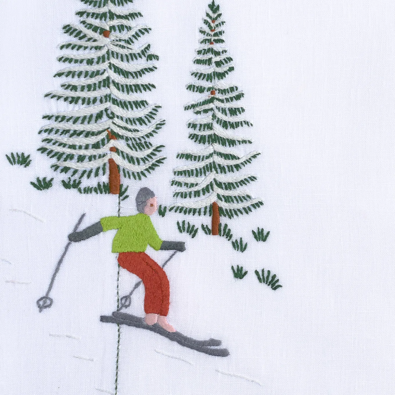 This rectangular hand-embroidered placemat set includes one placemat and one napkin (50x50cm), crafted from 100% Italian linen. The delicate ski design is meticulously embroidered by hand using high-quality cotton thread. Perfect for bringing the cozy elegance of the slopes to any dining table, this set is ideal for winter dinners or special alpine-themed gatherings, combining functionality with a refined aesthetic.