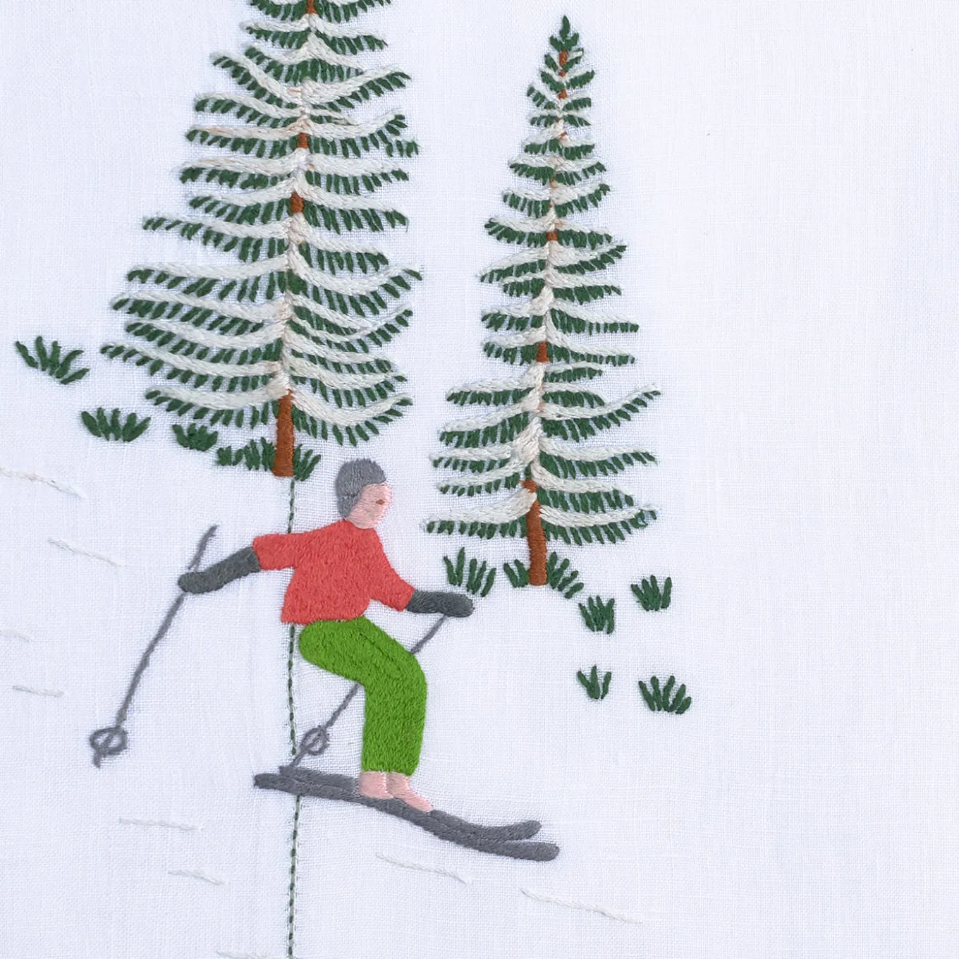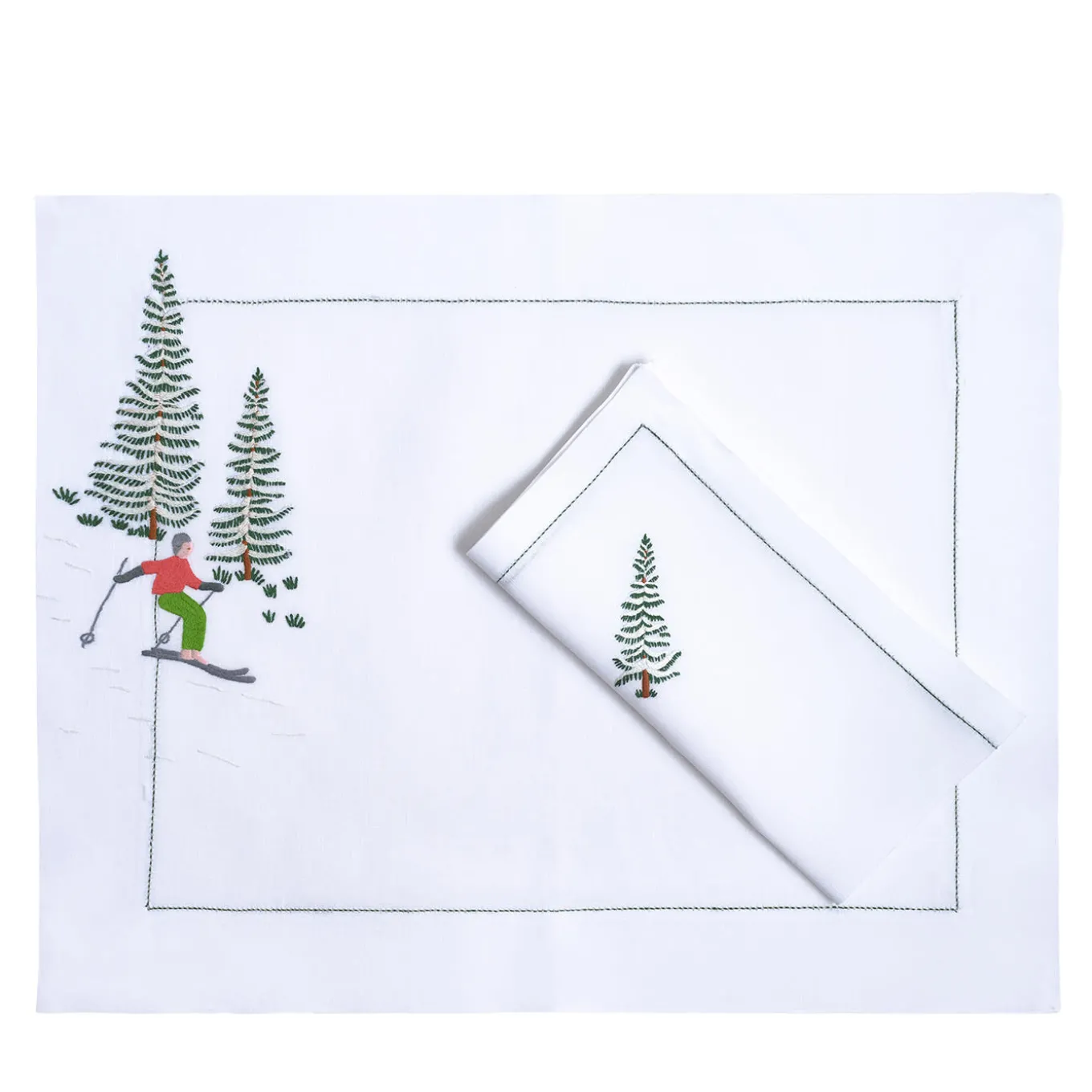 This rectangular hand-embroidered placemat set includes one placemat and one napkin (50x50cm), crafted from 100% Italian linen. The delicate ski design is meticulously embroidered by hand using high-quality cotton thread. Perfect for bringing the cozy elegance of the slopes to your dining table, this set is ideal for winter dinners or special alpine-themed gatherings, combining functionality with a refined aesthetic.