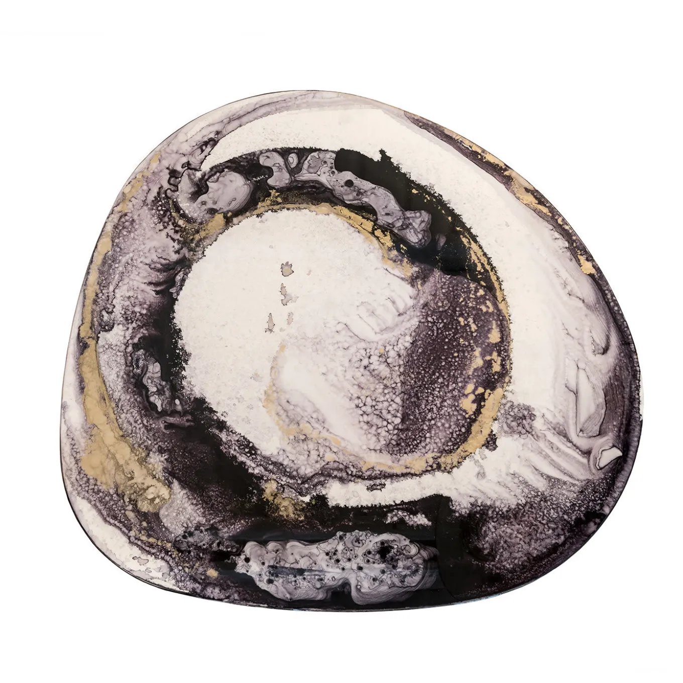 This is set of two coffee tables is made from glossy polyester, which is handpainted with a dynamic swirl motif in black and white. Both tables feature black-painted wooden legs tipped in brass. Their unique, organic, curved tops bring a modern edge to any environment. As each table is handpainted, no two items are exactly alike. Customizable.