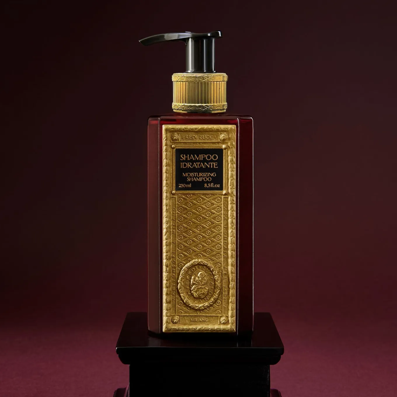 The Eredi Zucca shampoo set offers a perfect balance of refreshment and nourishment. The mint shampoo, enriched with menthol, coco-glucoside, and glycerine, provides a luxurious, hydrating cleanse, while the moisturizing shampoo, infused with glycerine, guar gum, and wheat protein, restores vitality to frizzy, damaged hair. Both feature the woody-citrus Vetiverum fragrance and come in elegant 250 ml burgundy PETG bottles adorned with brass Eredi Zucca details.