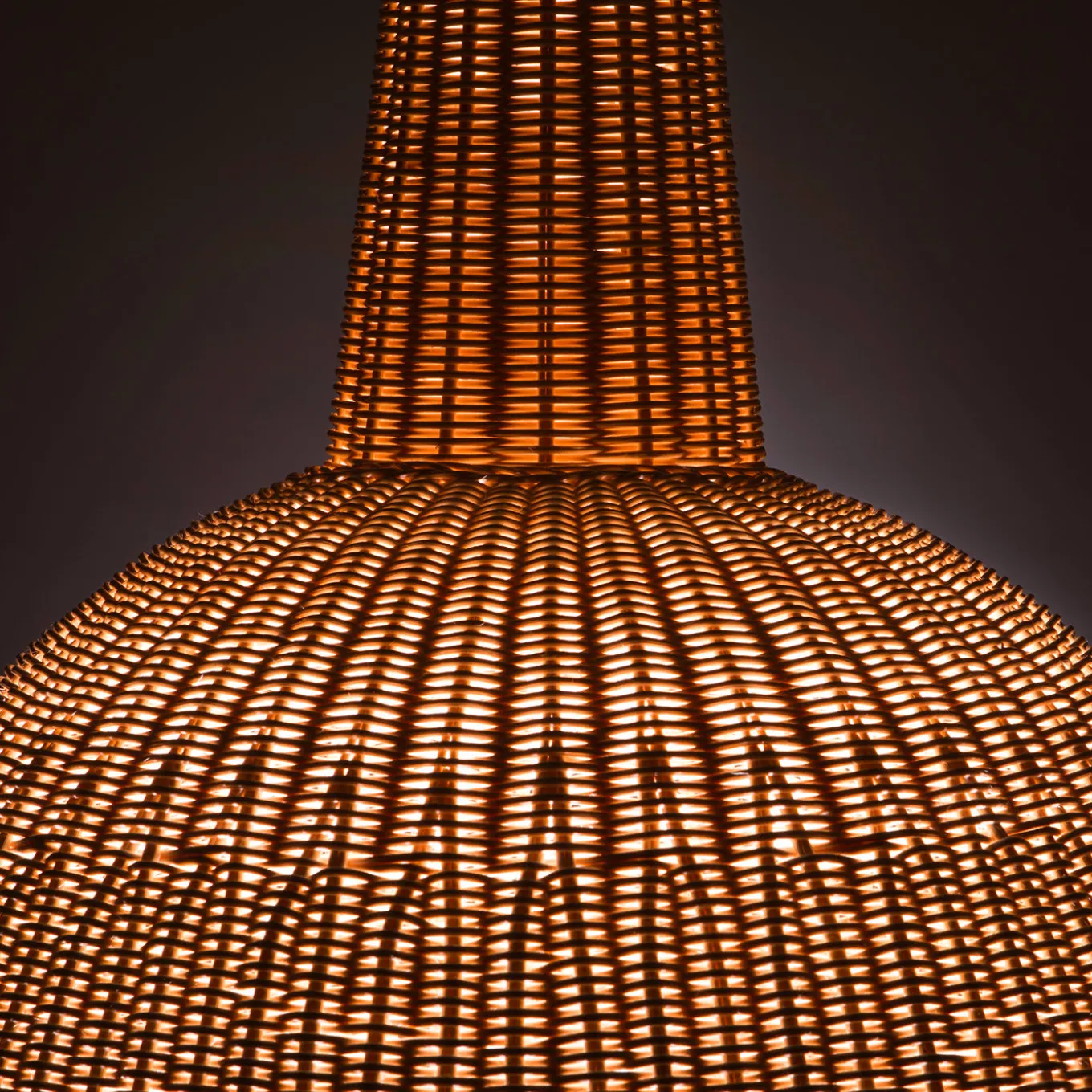 This lamp features a rounded woven rattan shade in a natural color. The round segment interlocks seamlessly with the conical base. The Sfera lamp’s detailed weave and expert craftsmanship create a captivating visual effect when lit, casting an intricate play of light and shadow. The rattan weave offers a refined, artisanal quality and a natural look. Available in Terra and Miele colors. Please contact the concierge for more details.