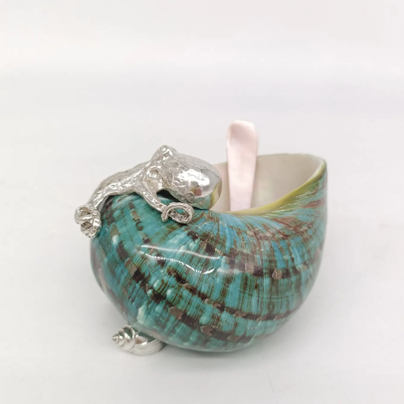 Salt cellar crafted from a turquoise Turbo Imperialis seashell accented with 925 silver details, including a unique octopus motif adorning the exterior. A 9 cm mother-of-pearl spoon complements the piece, designed for precise seasoning. Both the top and base of the cellar feature marine-inspired decoration, with silver elements treated for protection, blending functionality with elegant sea-themed artistry.