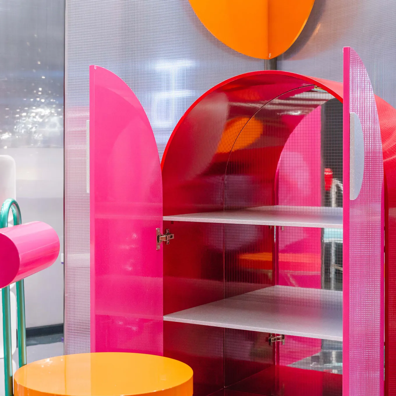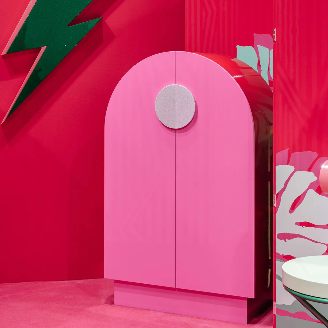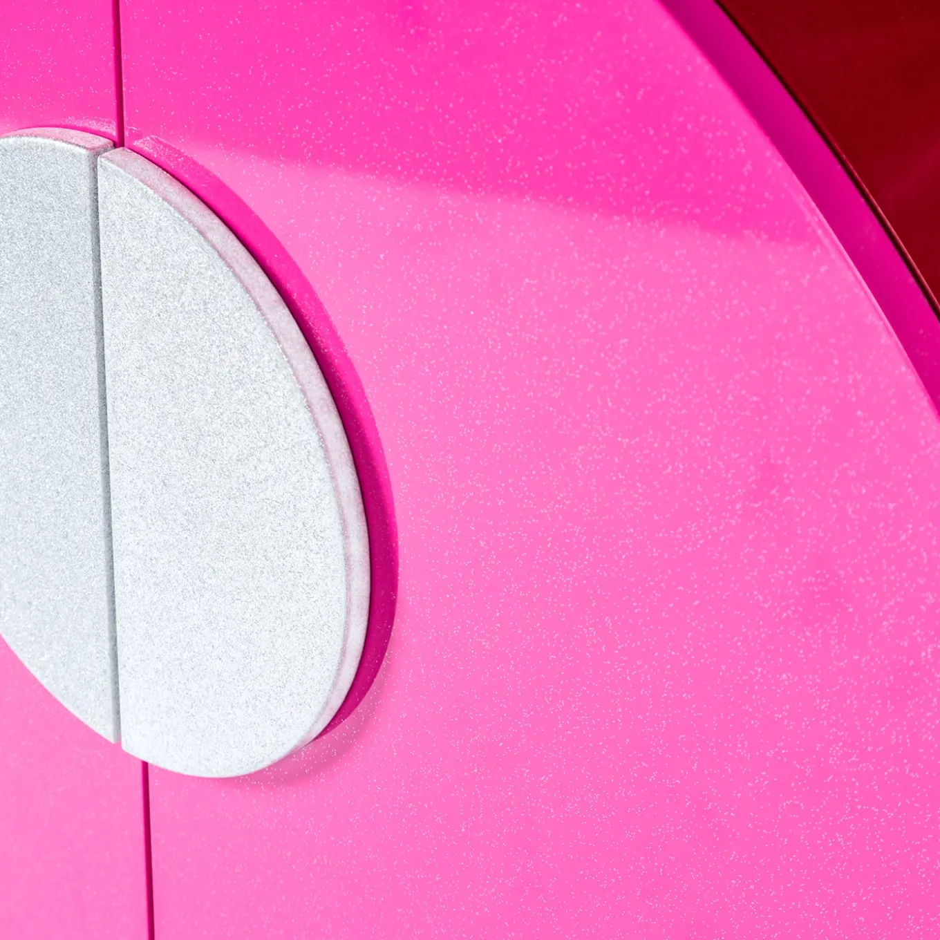An iconic and lively accent to a contemporary setting, this small cabinet is resplendent with lively glittering hues. Handmade of metal lacquered in a pink hue, enhanced with silver glittery details, it boasts the form of a petite spacecraft, seemingly ready to take off to new planets. Please consult the Concierge for further information.