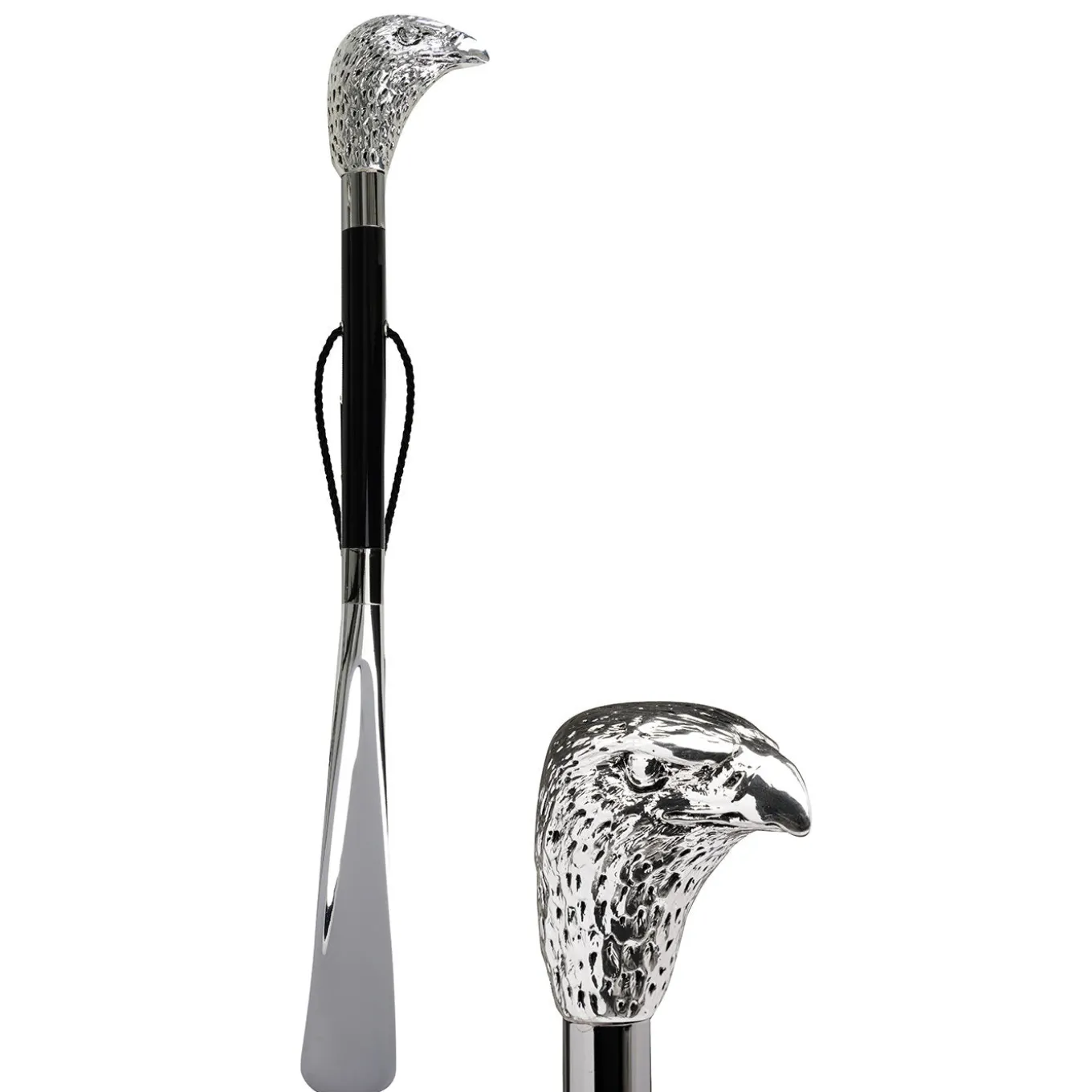 Coming in a precious branded case, this handcrafted shoehorn has its ornamental focus in the luminous handle shaped like an eagle’s head made of powder-coated marble with sterling silver details. Meticulously crafted, the grip is combined with a solid beech shaft lacquered in glossy black and with a silvery paddle in ABS smoothly guiding the foot in the shoe. Silver-finished brass rings and a fabric loop for easy hanging complete the structure.