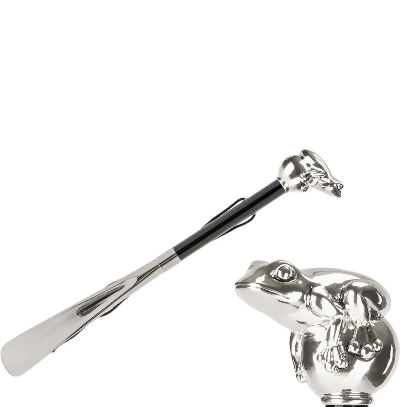 An elegant accessory entirely handmade in Italy, the Silver Frog Shoehorn features a handle in the form of a charming frog sitting atop a ball crafted from silver plated resin. It also has a wooden shaft, an ABS end and measures 50 cm in length.